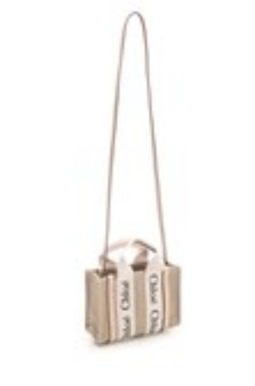 Mini "Woody" handbag in linen canvas from Chloè with leather details, bands with lettering logo, two fixed handles and adjustable and removable shoulder strap.