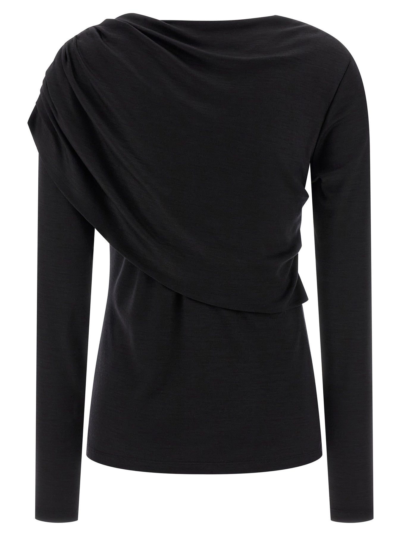 'Asna' draped wool jersey top with round neckline, curled insert on the shoulder, long sleeves.