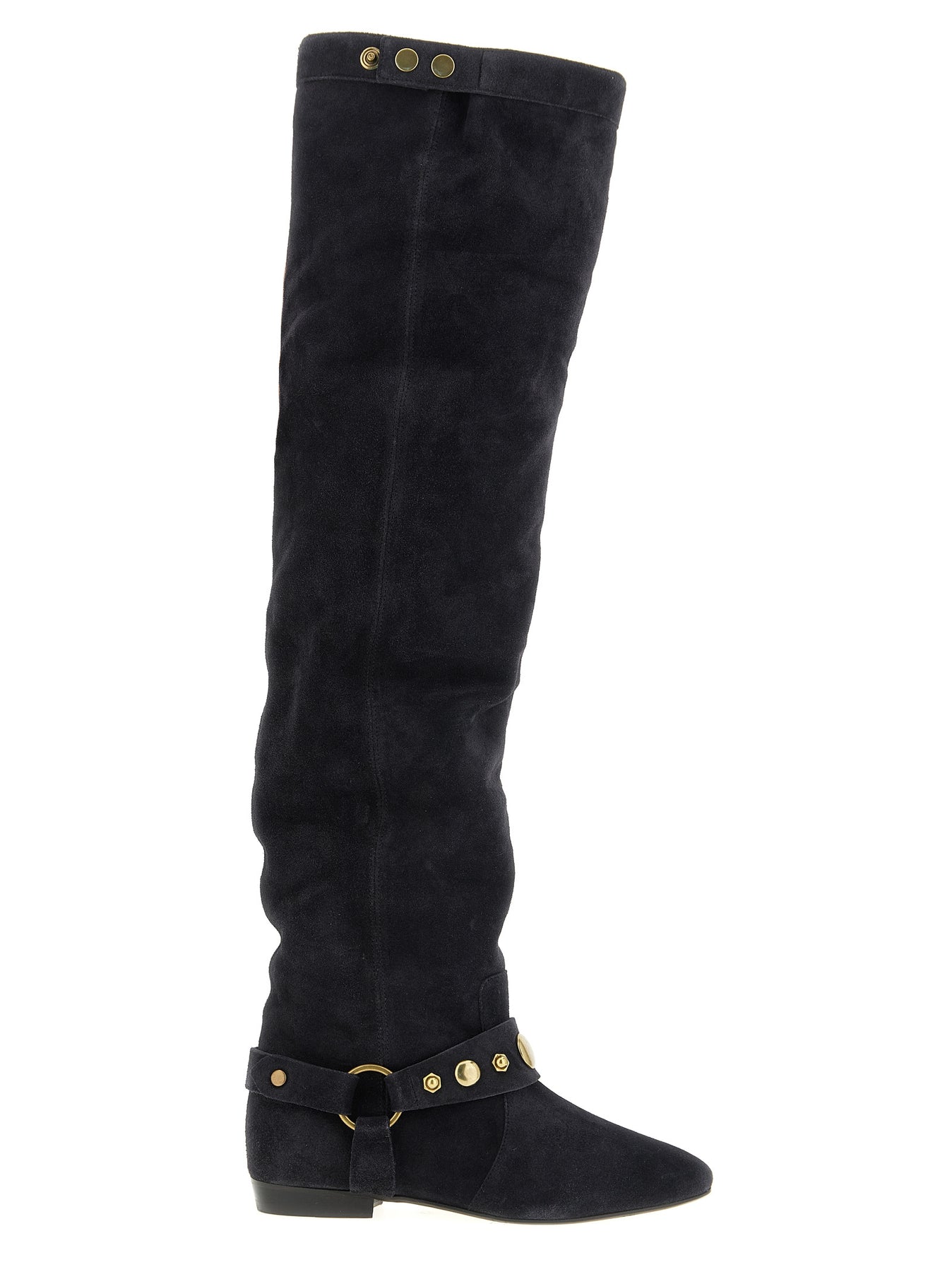 'Selize' suede boots, soft leg with snap buttons, slightly pointed model, strap with antiqued effect metal details on the instep, leather sole.