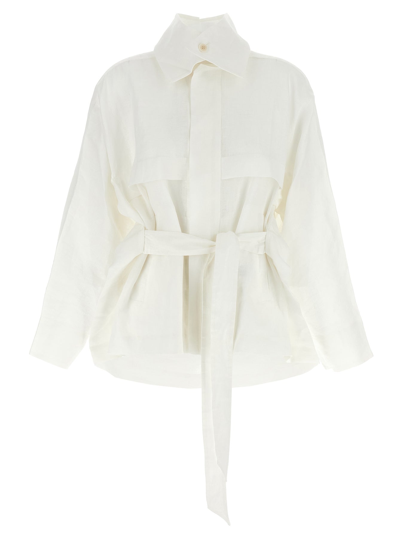 'Hempen' hemp jacket with reinforcing coating, adjustable collar, front hidden zip closure, pockets, long sleeves with dropped shoulders, belt to tie at the waist, unlined.