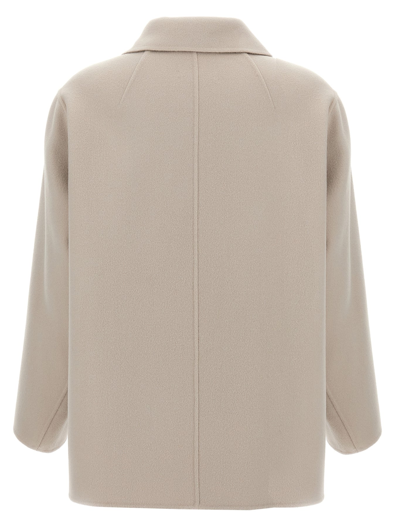 'Lily' overshirt in double drap of pure wool sewn by hand, collar, front button closure, pockets, long sleeves, asymmetrical hem, side slits, unlined.