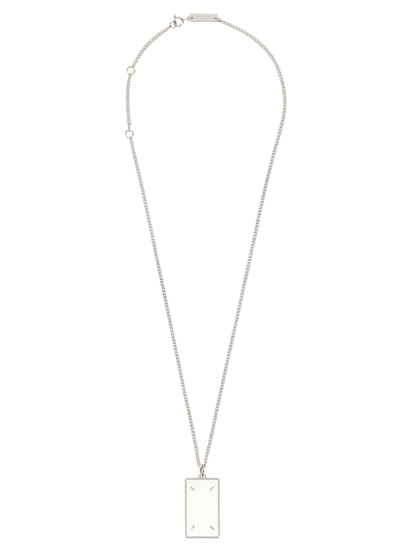 Metal chain necklace with adjustable 'Four Stitches' pendant and carabiner closure.