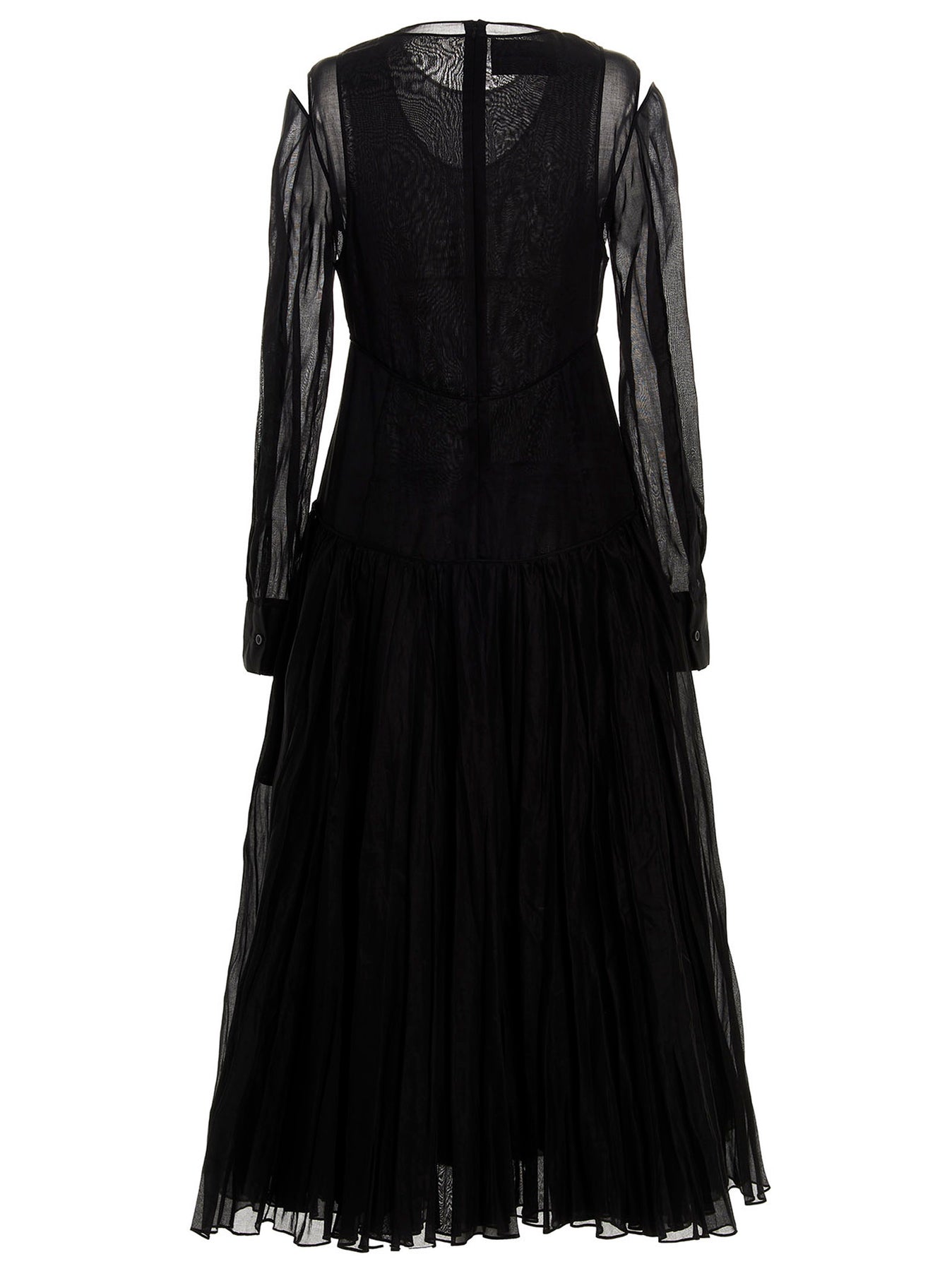 Cotton dress with loose pleated skirt, back zip closure, long cuffed sleeves, cut out detail on the shoulder and a crewneck.