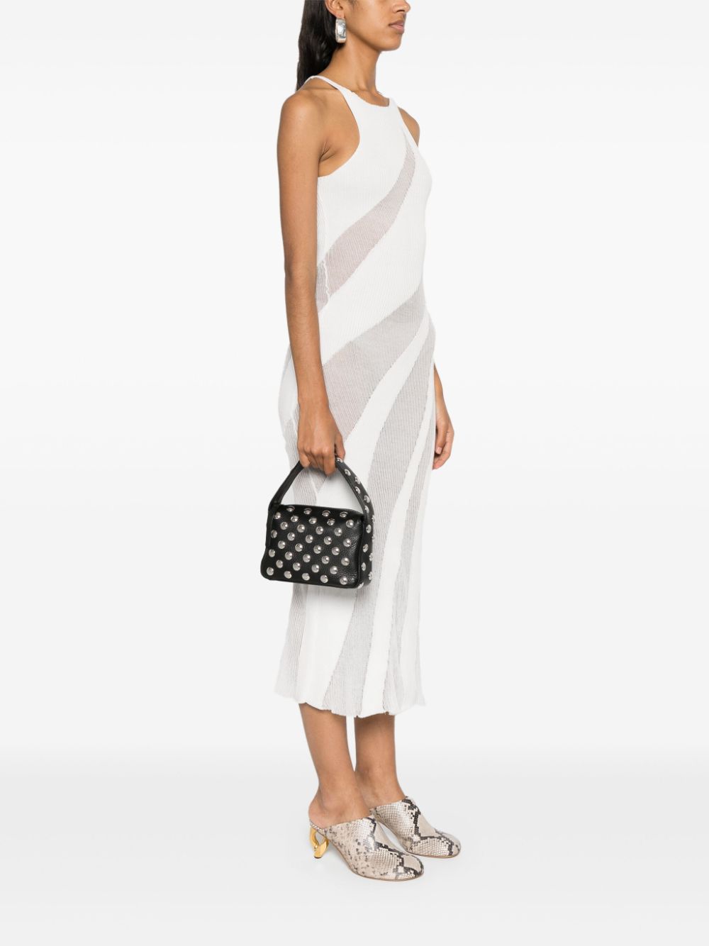 black calf leather grained texture stud embellishment single toe strap main compartment internal slip pocket debossed internal logo full lining silver-tone hardware top zip fastening