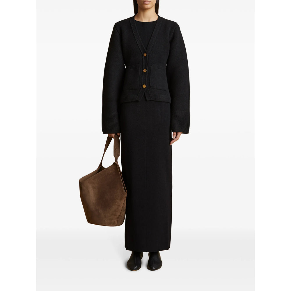 black cashmere blend knitted construction ribbed edge V-neck extra-long sleeves two front patch pockets straight hem