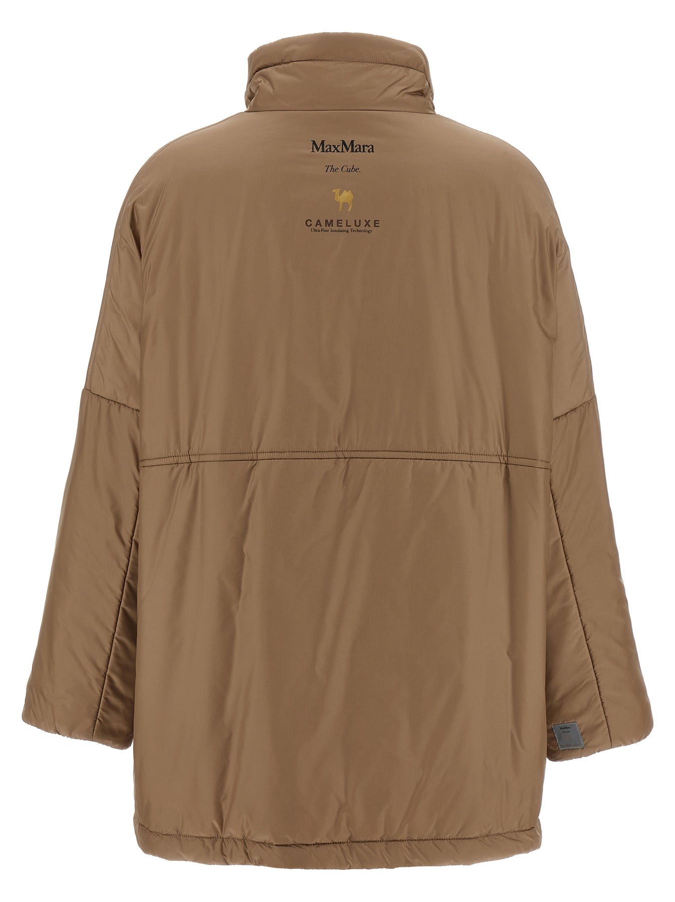 'Paris' slightly padded Cameluxe waterproof cloth down jacket, back print, high neck, front zip closure, pockets, 3/4 sleeves with dropped shoulders, drawstring at the hem.