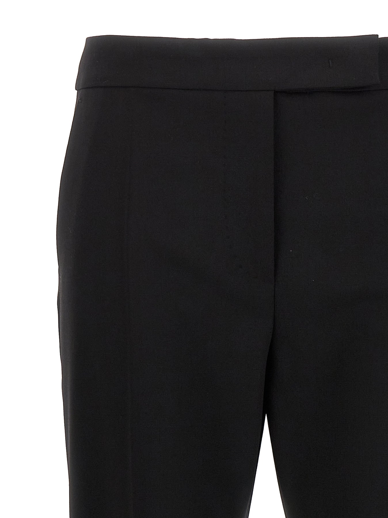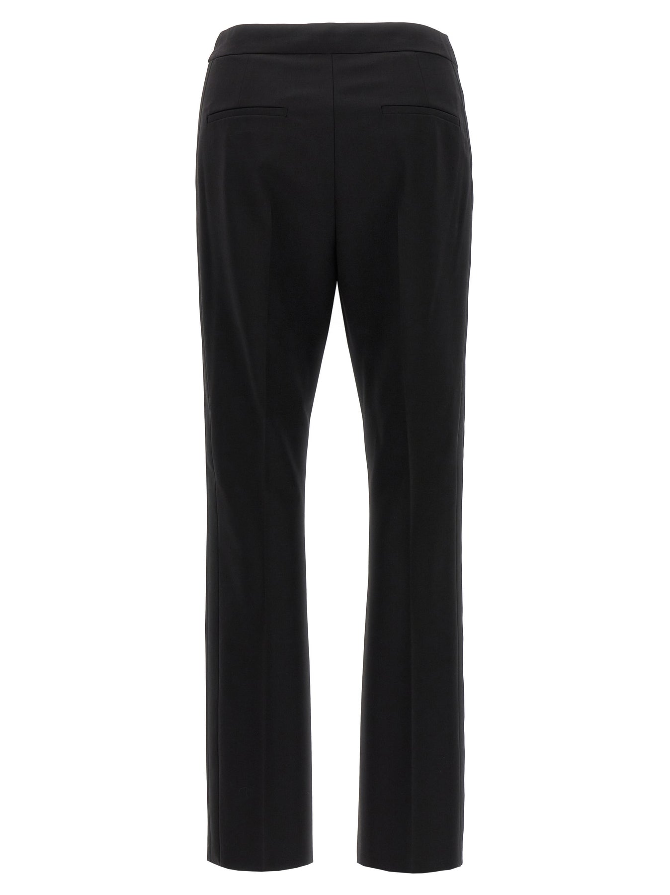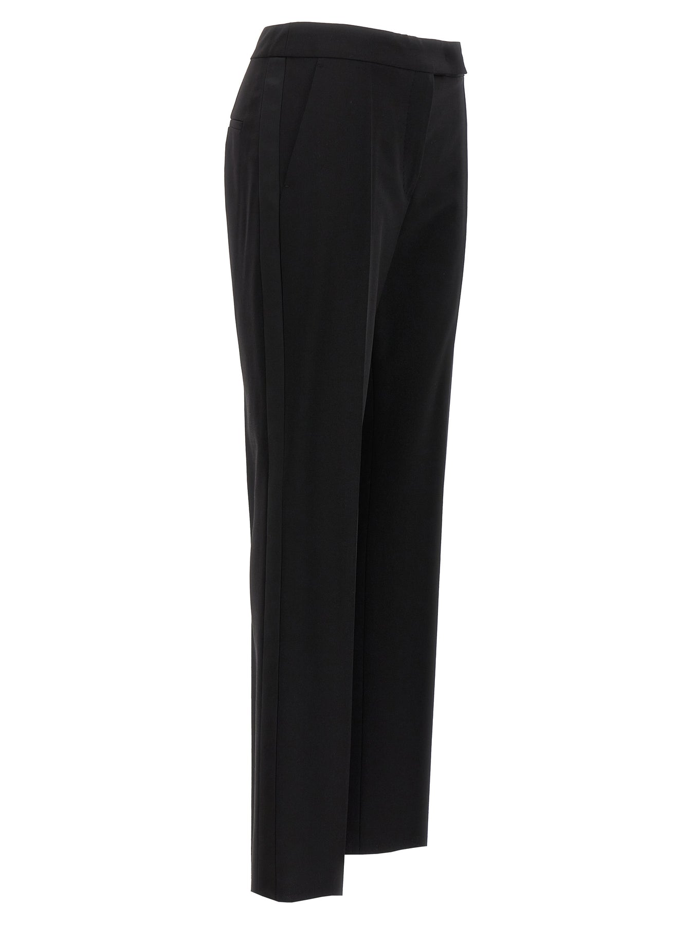'Rino' wool blend pants with tone-on-tone satin side bands, hook and button zip closure, pockets.