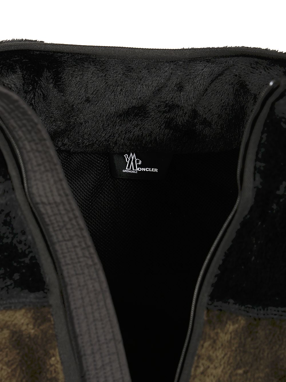The vest features a two-tone design, with a black fleece upper and an olive green main body. It features a zip closure and a Moncler Grenoble logo on the chest.