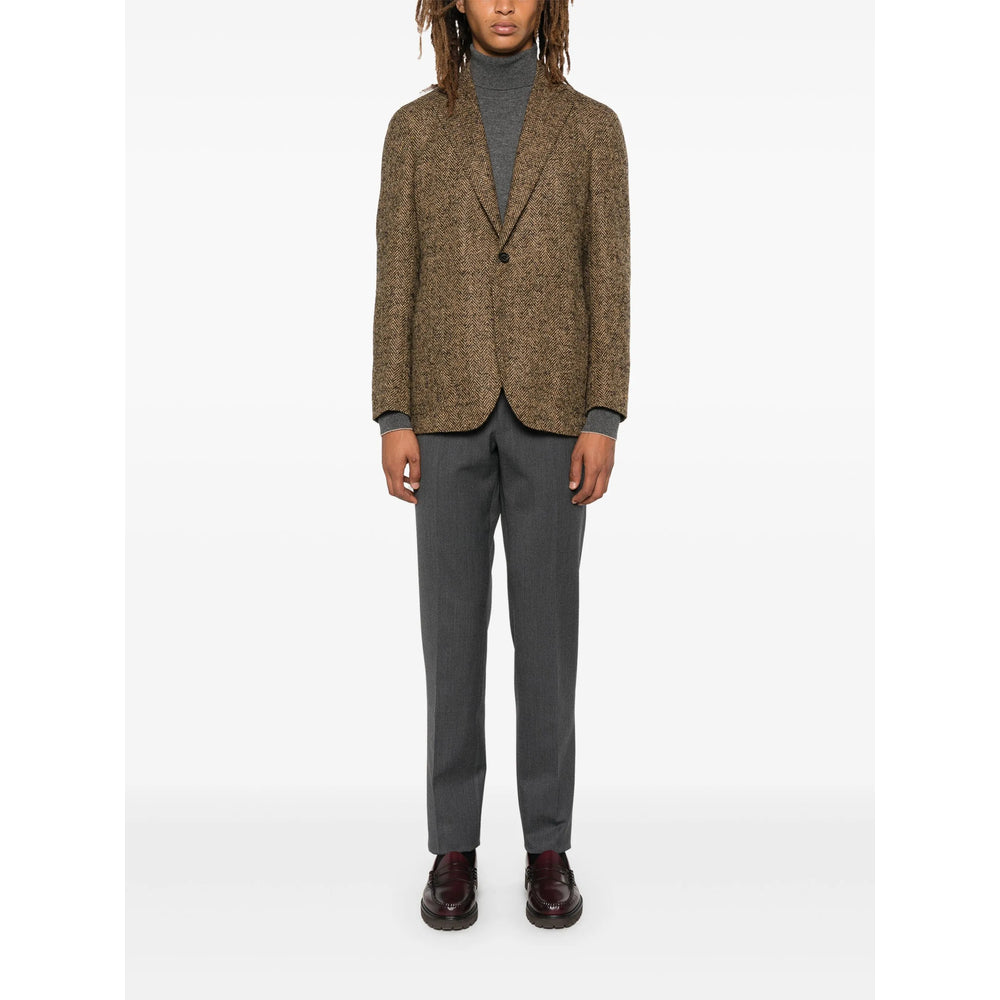 dark grey virgin wool blend gabardine weave tailored design front button and zip fastening belt loops pressed crease two side inset pockets two rear button-fastening pockets tapered leg
