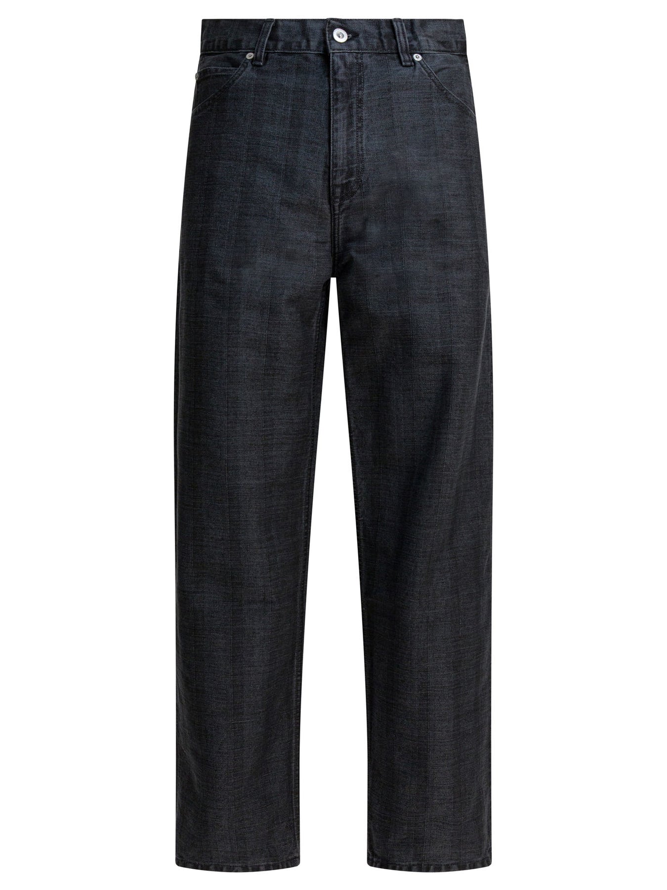 Our Legacy "Vast Cut" jeans with Italian herringbone denim construction featuring a pigment print layer. The construction features loose, loose fit with high waist, subtle stripe pattern visible through wash treatment, and functional details such as YKK zipper closure. Five integrated pockets, steel rivets and embossed Our Legacy patch complete the design. || - Denim - Pigment print layer - Fine stripe pattern - Wide cut - High waist - Five pockets - Steel rivets - YKK zipper closure - Our Legacy embossed patch - Wide fit