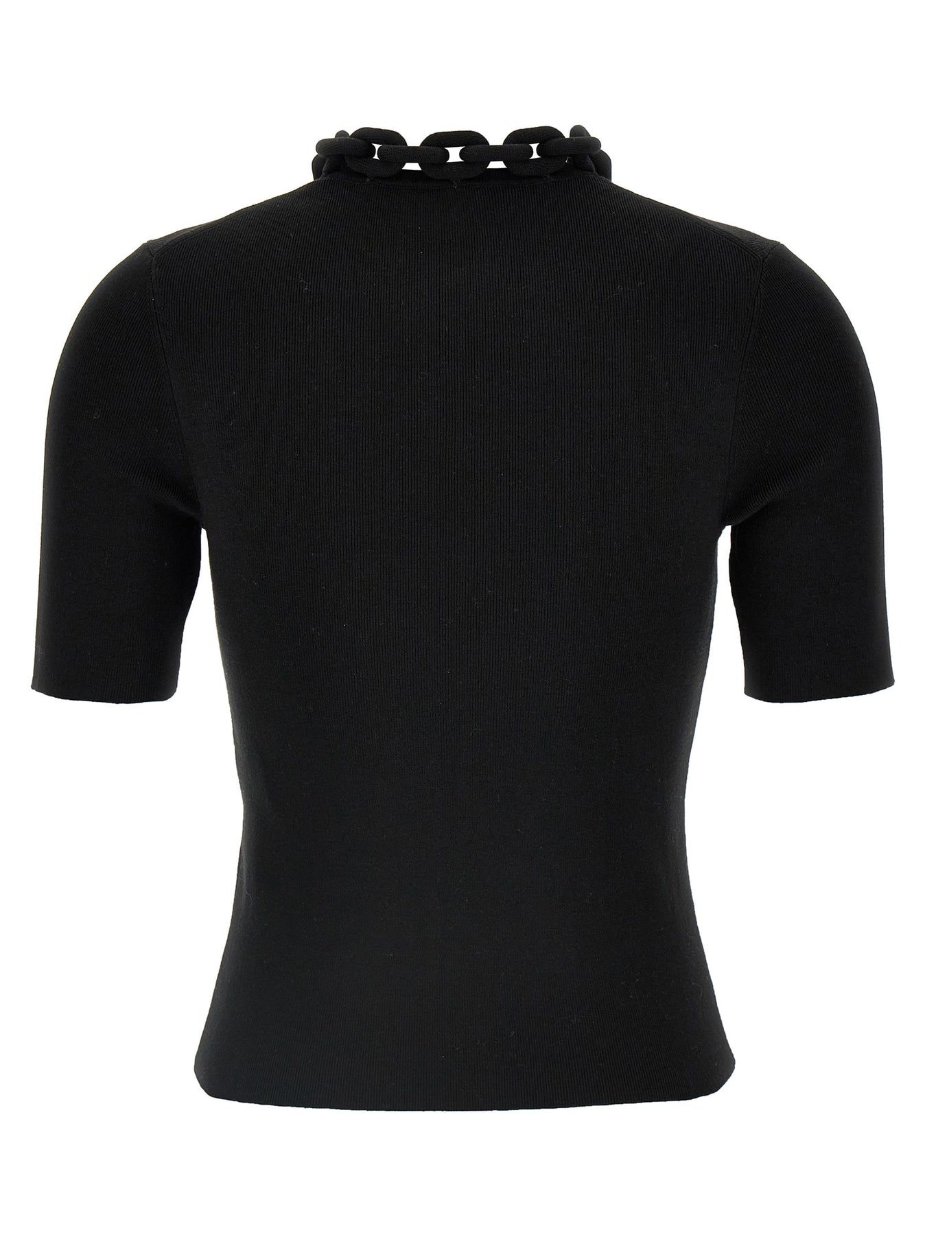 Micro ribbed stretch cotton T-shirt, crew neck with metal and fabric chain detail, short sleeves.