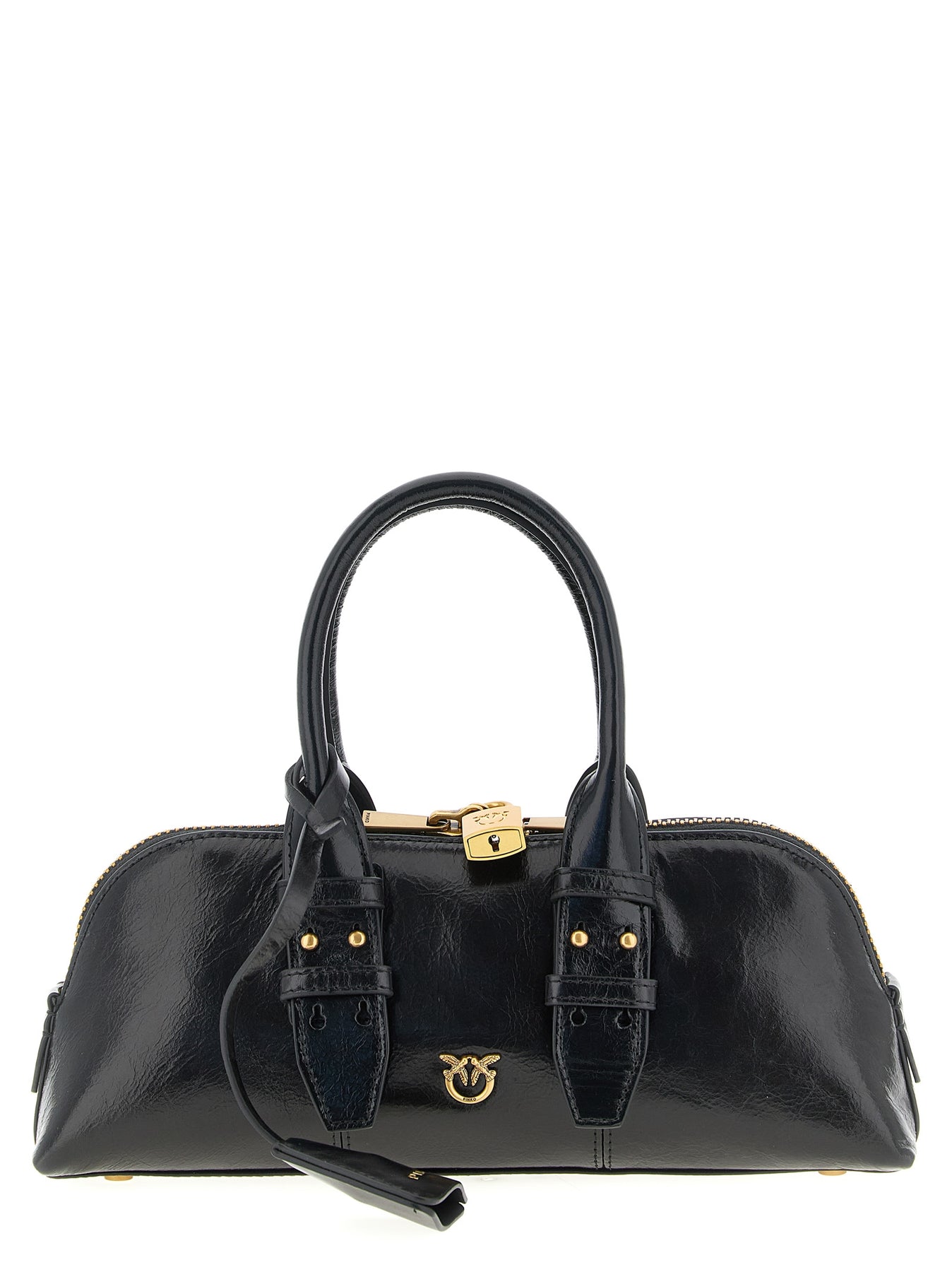 Small 'Escape Baguette' bowling handbag with varnished effect, metal 'Love Birds' logo on the front and embroidered back, double adjustable handle, top zip closure with padlock detail, rigid base with metal feet, cotton lining, removable charm, adjustable and removable shoulder strap.