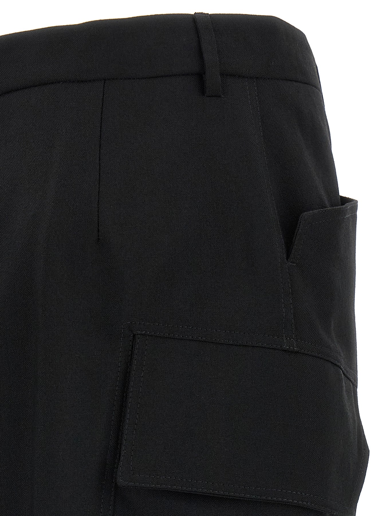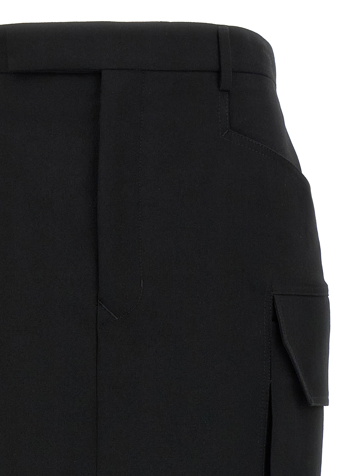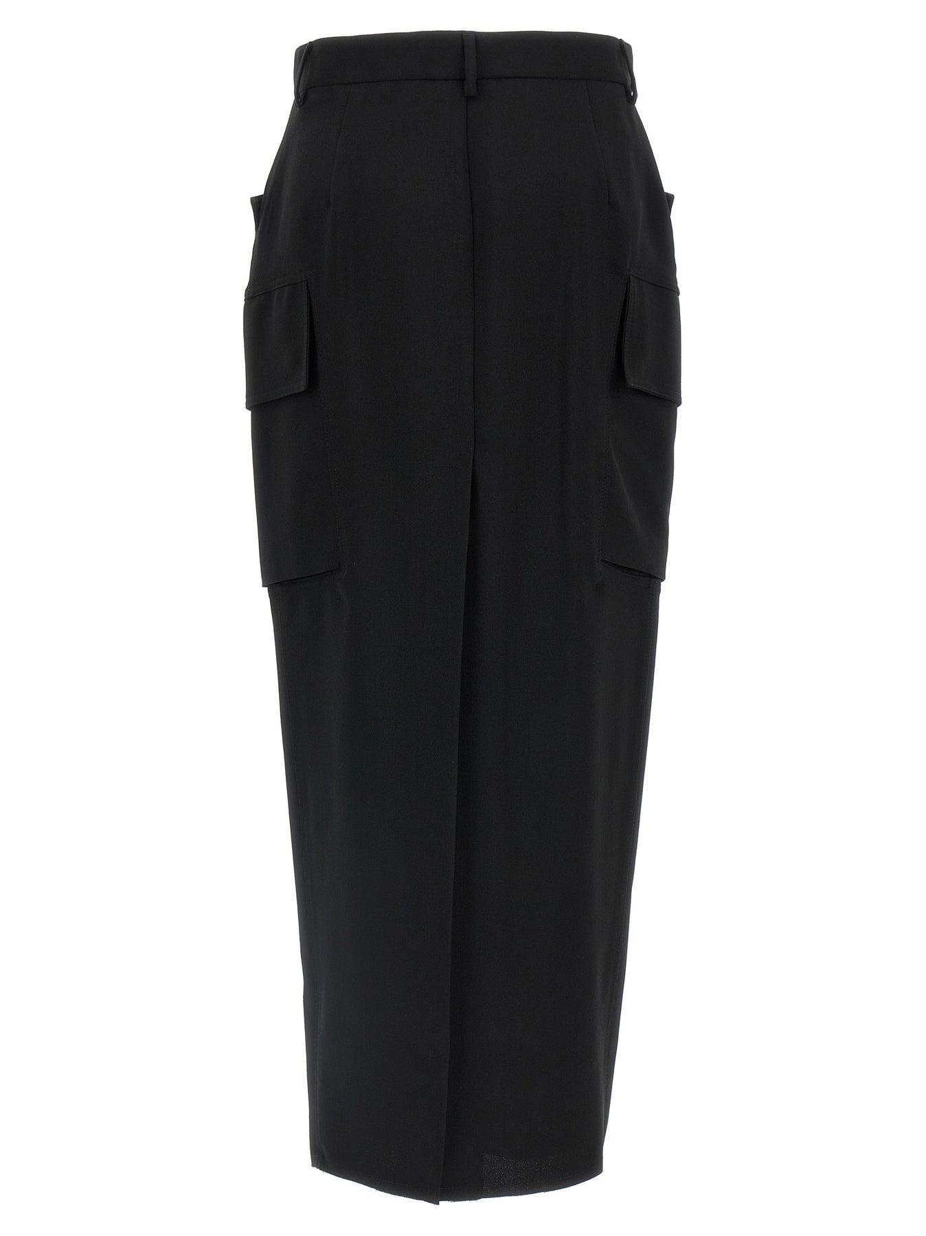 'Firebanks' wool midi skirt, cupro lining, cargo style with side pockets, zip hook and front button closure, pockets, wide back split.