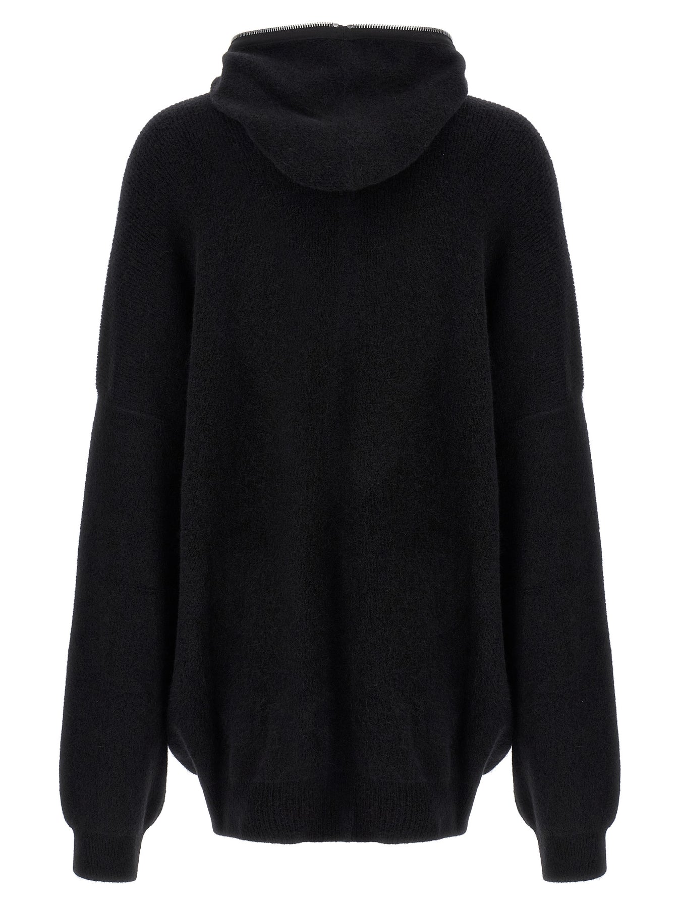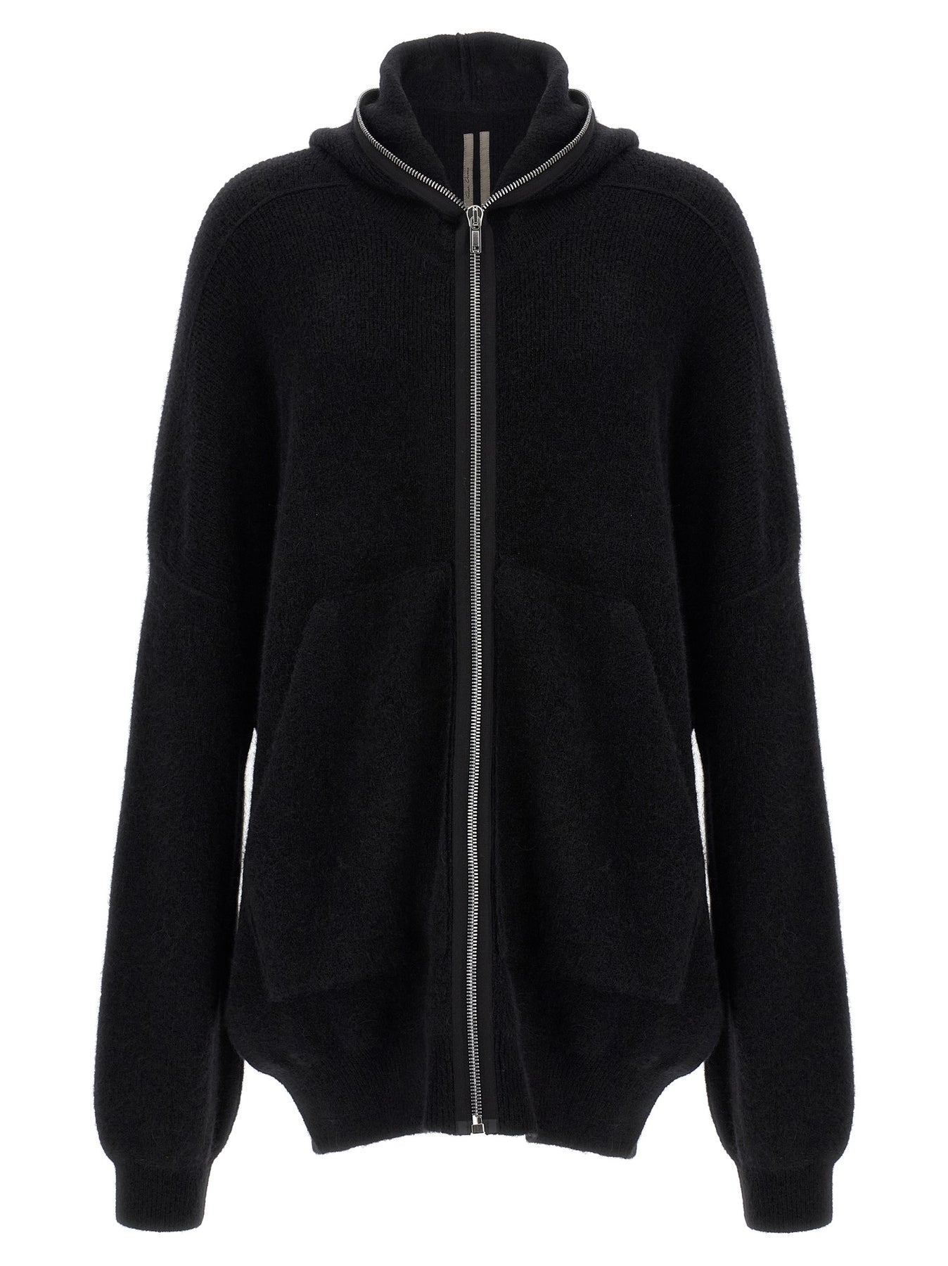 Alpaca wool blend cardigan, hood, front zip closure, pockets, long sleeves with cuffs and dropped shoulders.