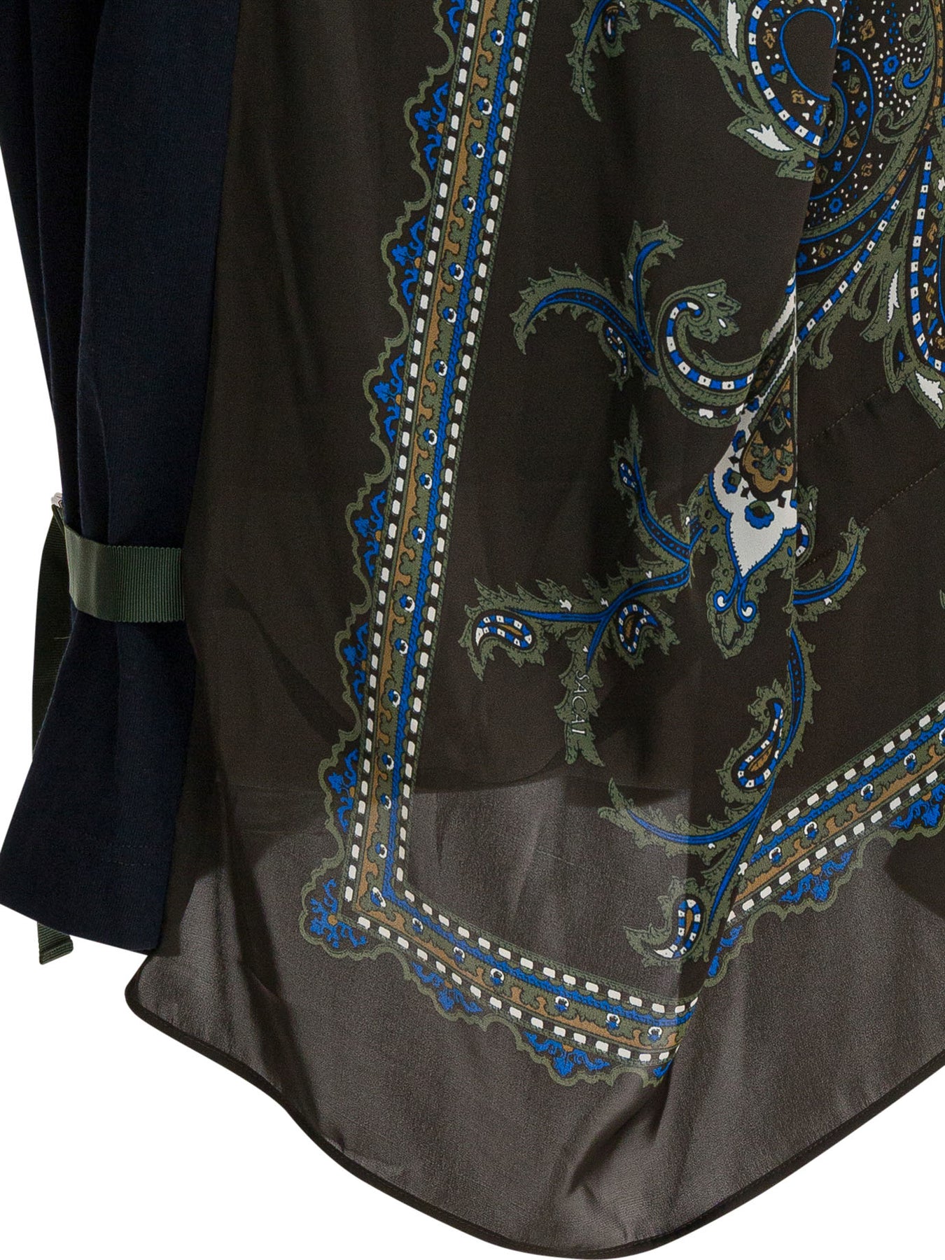 Sacai paisley-print cotton t-shirt made with asymmetrical construction and attached strap detail. The design features a relaxed-cut silhouette and short sleeves. The construction combines the texture of the cotton fabric with the front paisley pattern, integrating functional and decorative elements. The edge of the sleeves and bottom retains a basic, linear finish, with no overlapping elements. || - Short sleeves - Front paisley print - Asymmetrical design - Applied strap detail - Cotton - Relaxed fit