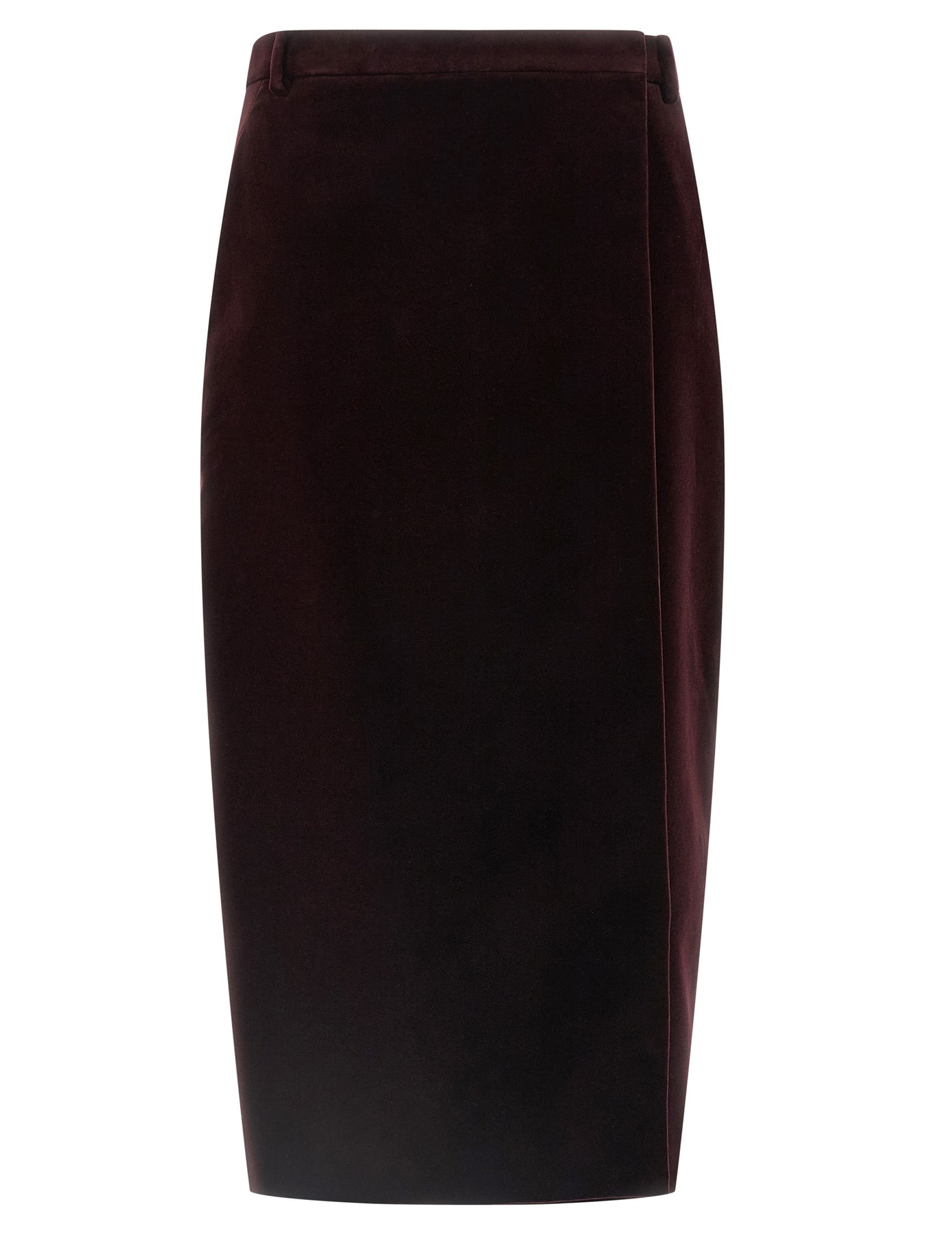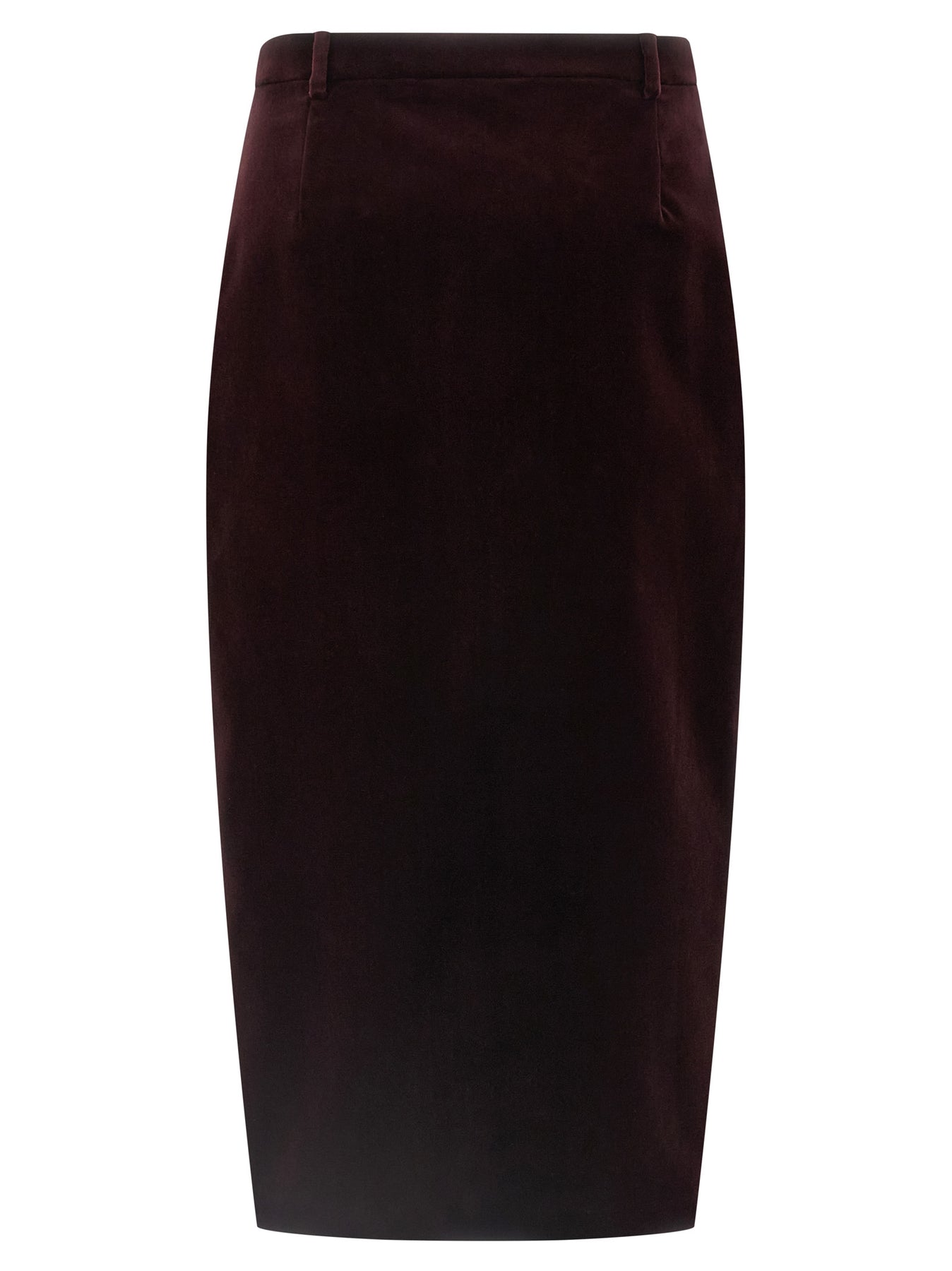 Midi skirt in cotton velvet, wallet style with button closure and front hook, pockets, silk lining.