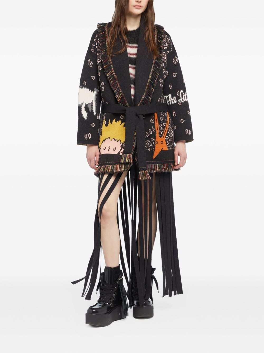 black wool Little Prince illustration bandana pattern fringed trim shawl collar