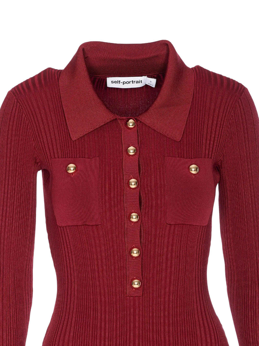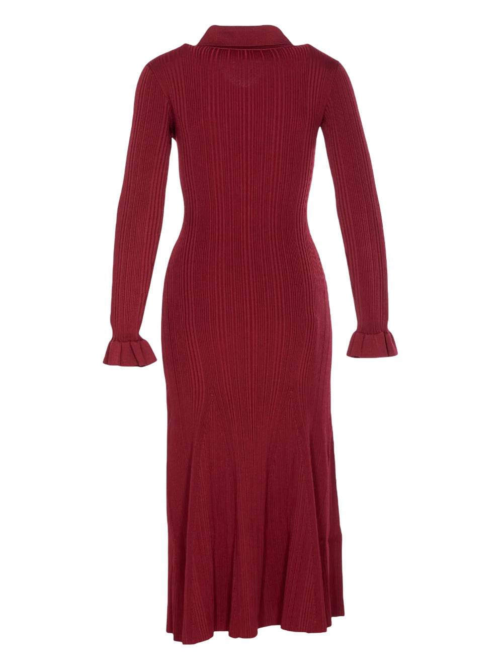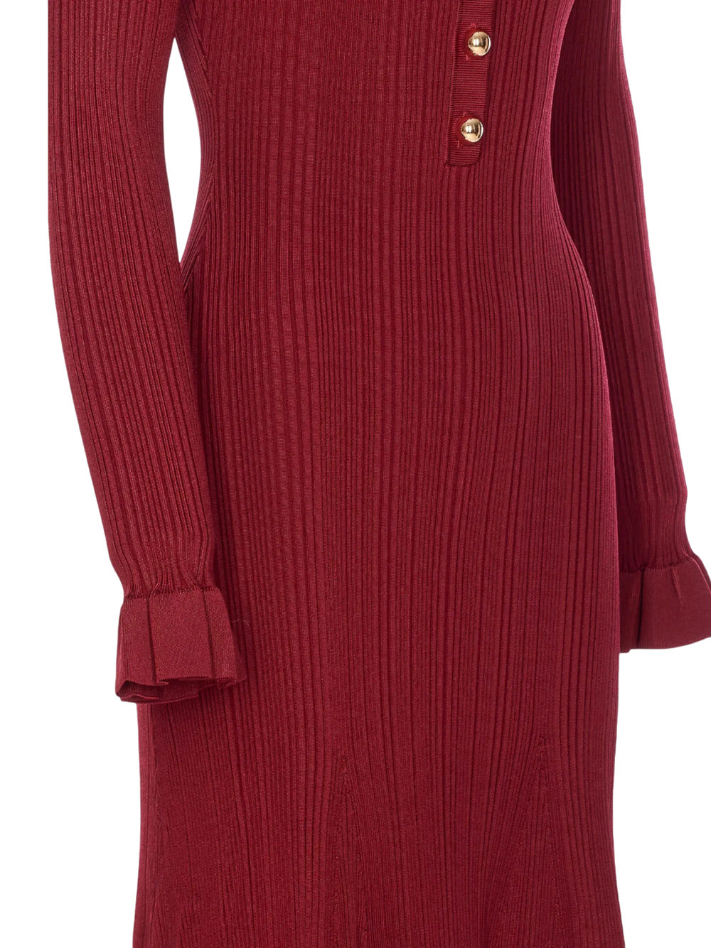 BURGUNDY RIBBED KNIT MIDI DRESS Crafted in burgundy ribbed knit for a relaxed yet sculpted fit, this midi dress features flared sleeves and a playful hem. Gold buttons add a touch of elegance: perfect with brogues for the office or dinner. True to size Fabric is stretchy Buttoned front Removable shoulder pads Ruffled cuffs Main fabric: 50% viscose, 32% polyester, 16% polyamide, 2% elastane (excluding trim) ID AW25008MABU