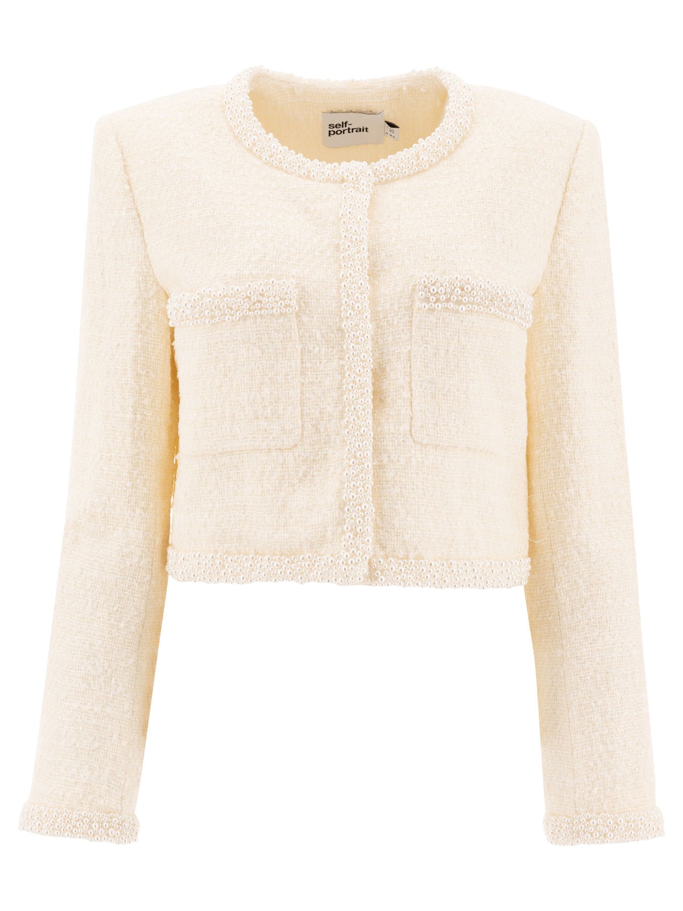 Self-portrait bouclé blazer made with compact structure and irregularly textured bouclé fabric. The garment features defined shoulder construction, straight profile and regular length, with front closure featuring concealed buttons and pearl-finished beading on the front. There are functional pockets integrated into the side seams for an essential look. || - Bouclé - Hidden button closure on the front - Functional pockets - Pearl trim - Regular fit