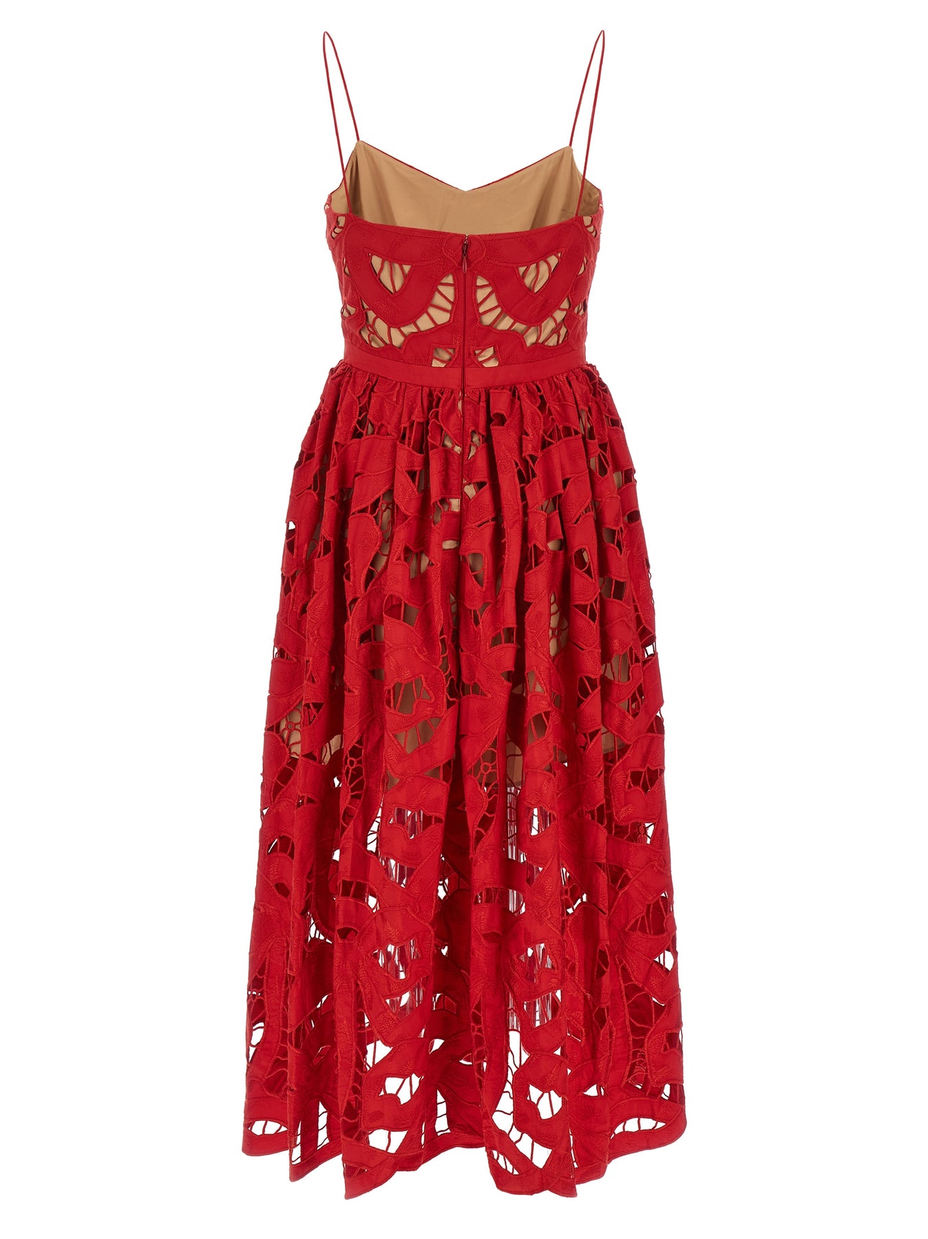 'Red Bow Embroidered Midi' sleeveless dress in cotton and openwork linen with thin straps, sweetheart neckline, back zip closure, half lining, belted waist and bow, wide skirt.