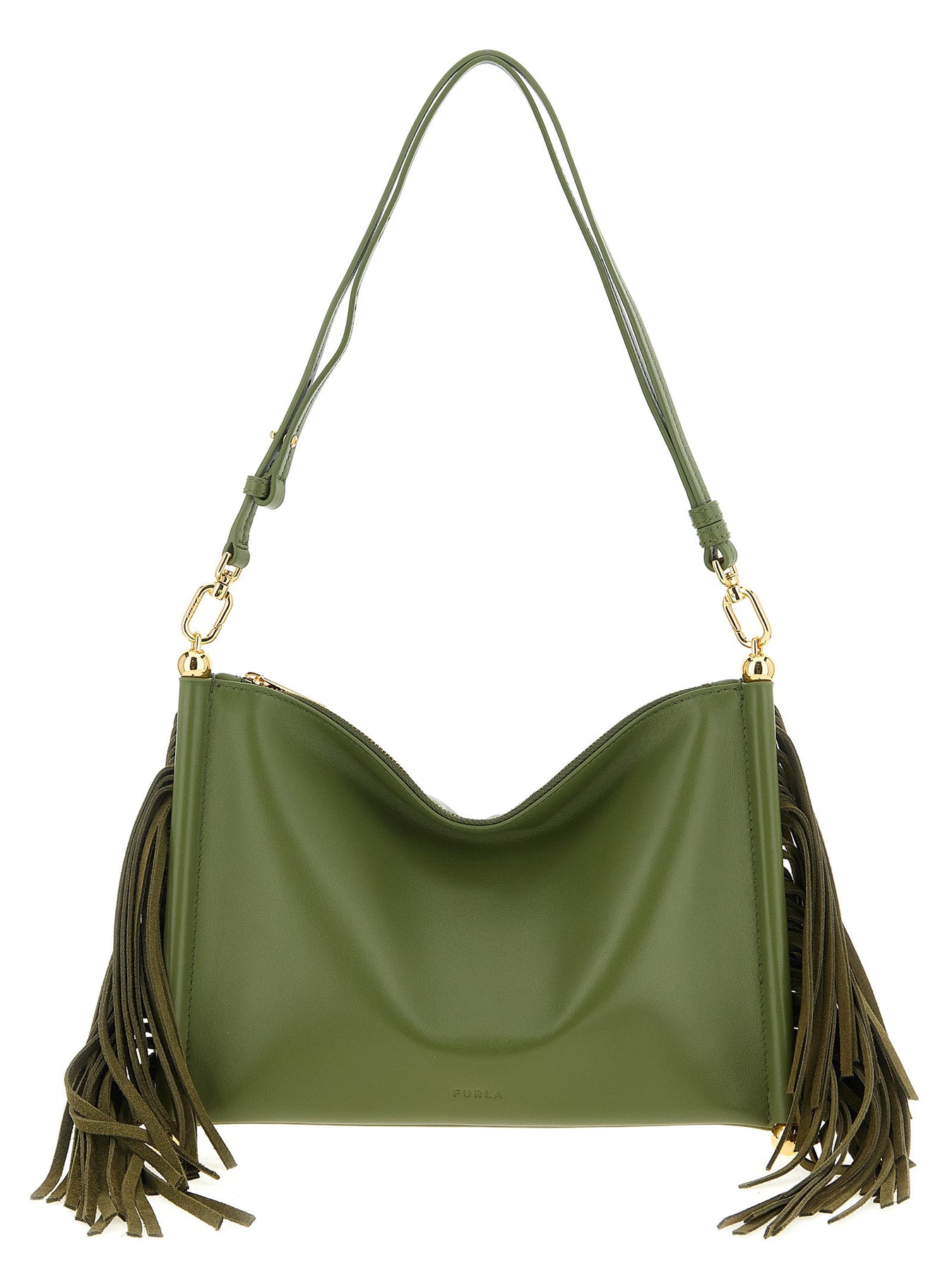 'Furla Sfera Soft' nappa mini shoulder bag, tone-on-tone fringes and metal ball hardware on the sides, front embossed logo, top zip closure, adjustable and removable shoulder strap.