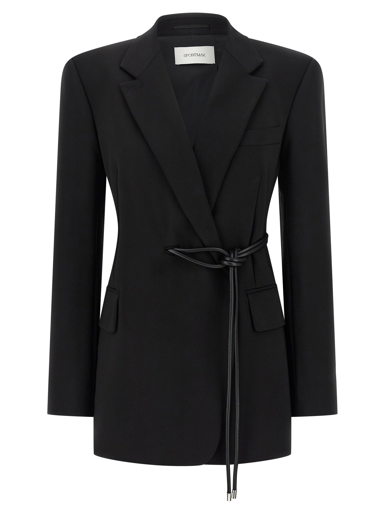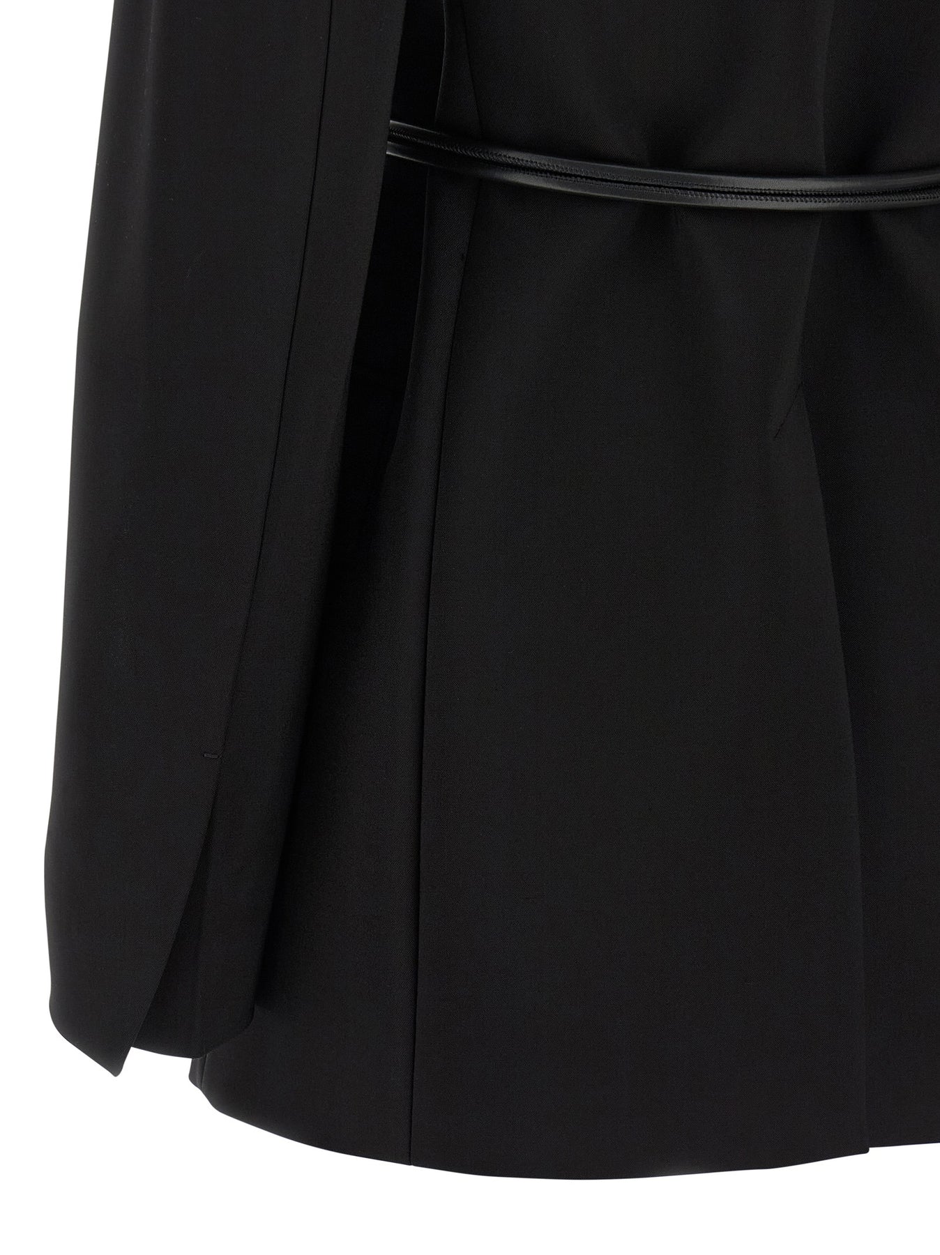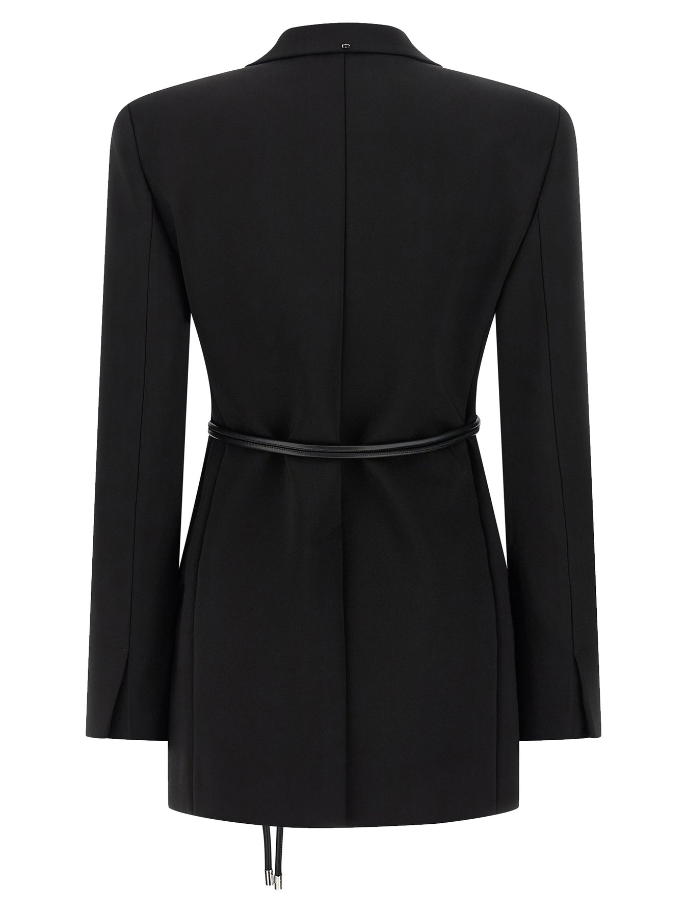 'Glassa' blazer in stretch viscose double canvas, double-breasted construction with leather belt to tie at the waist, peak lapels, chest pocket, flap pocket, padded shoulder, long sleeves, back vent, lining. The special construction with internal passage of the belt on the right side creates a play of asymmetries.