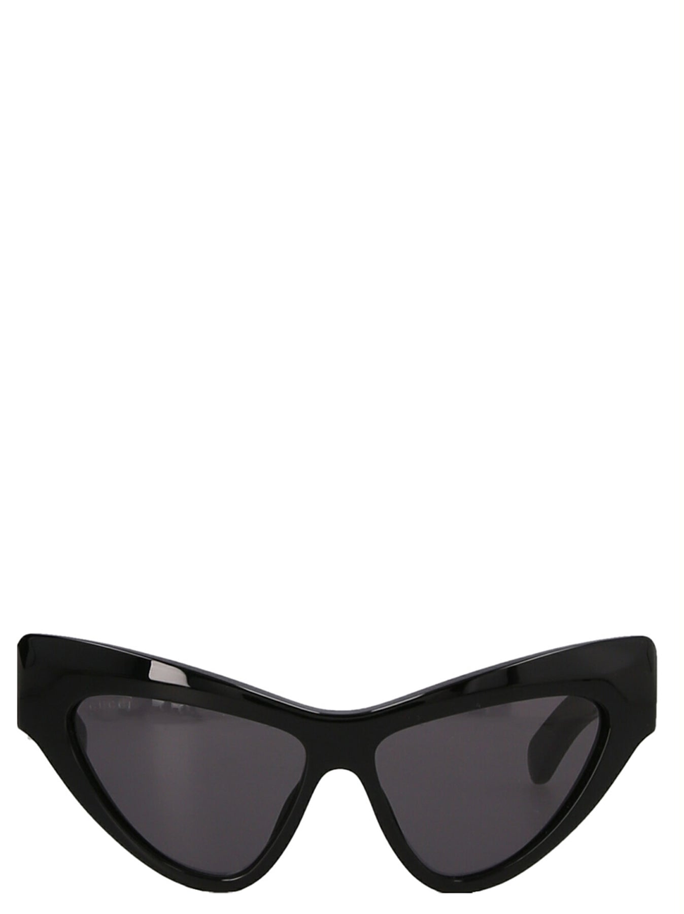 Cat eye sunglasses with a shiny black acetate frame, shiny black acetate temples with Gucci logo detailing and gray solid color lenses. TOTAL UVA/UVB protection