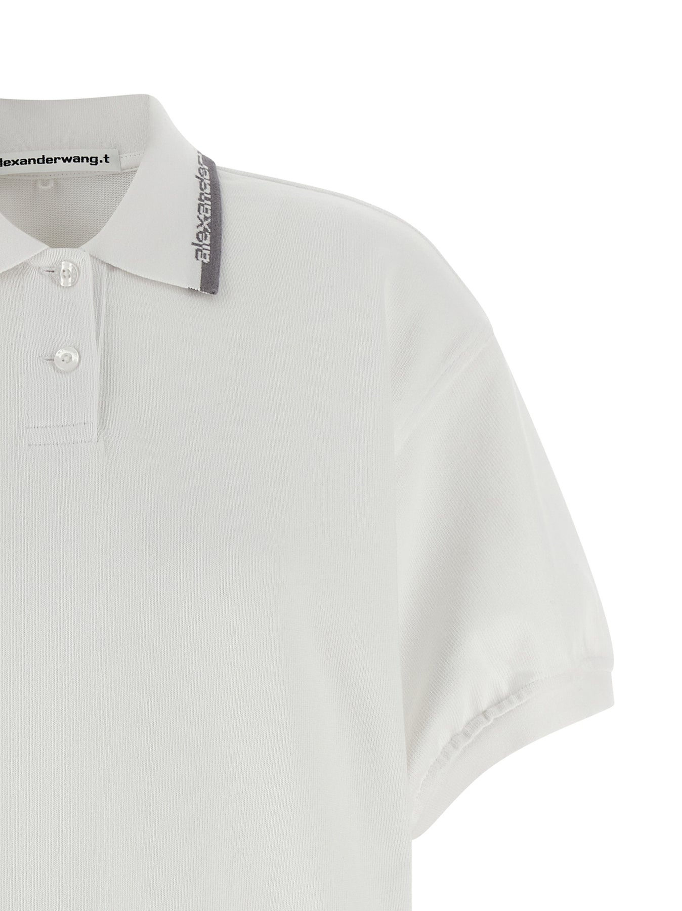 Compact Japanese cotton jersey polo dress with knitted collar with contrasting logo intarsia and buttons, short sleeves with cuffs, pockets, side slits.