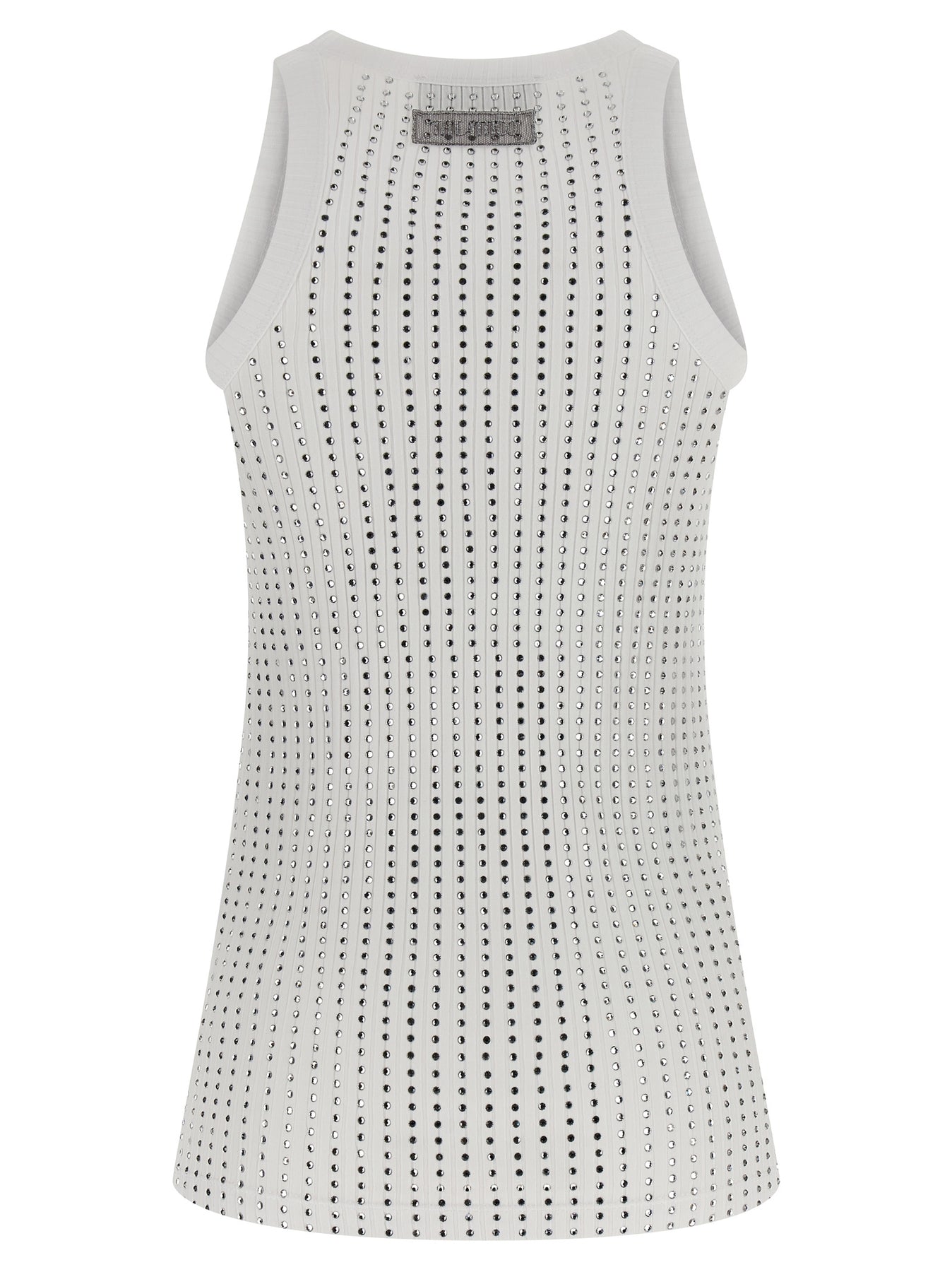 Ribbed stretch cotton tank top with all-over rhinestone appliqué, round neckline, and back logo patch.