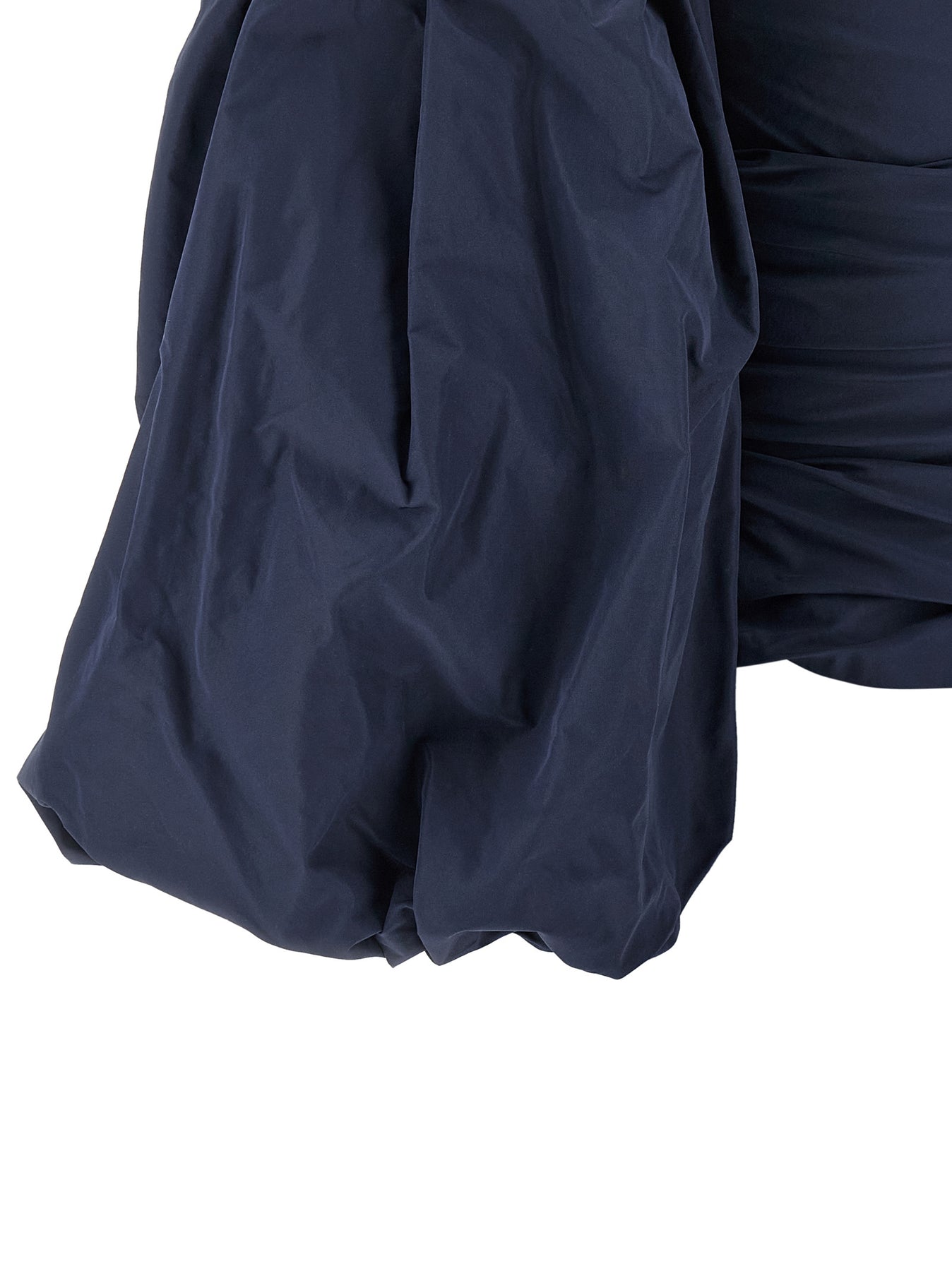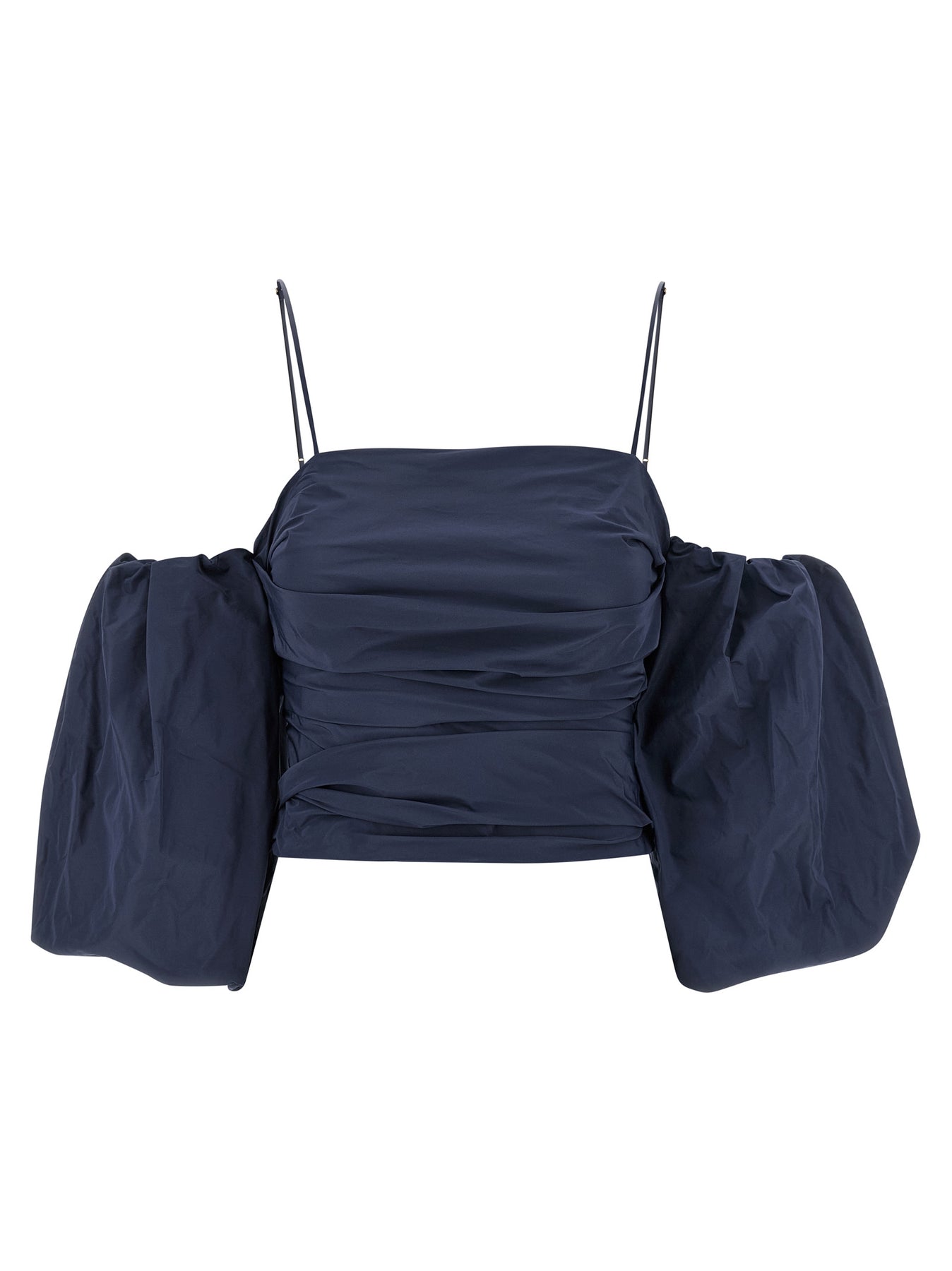 'Pallottoliere' bustier top in slightly ruffled taffeta with back hook closure and front and back pleats, thin adjustable straps, removable balloon sleeves with elastic cuffs.