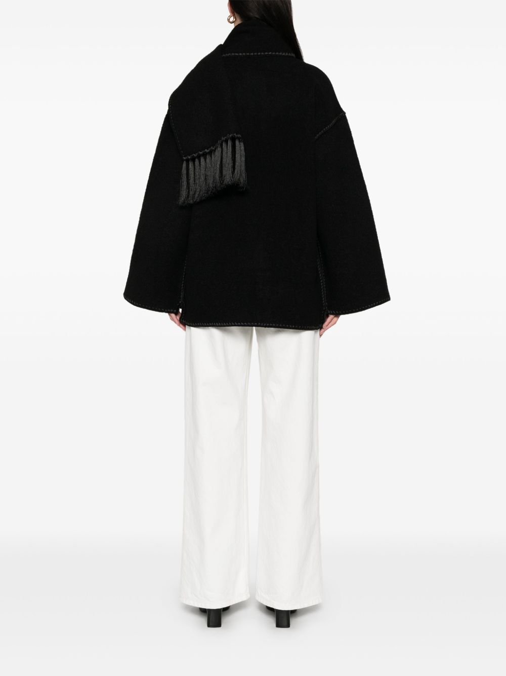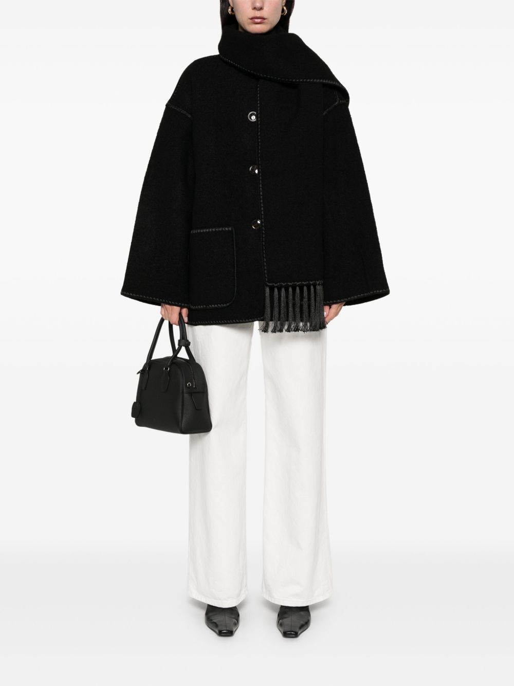 black front button fastening fringe detailing whipstitch trim two front patch pockets