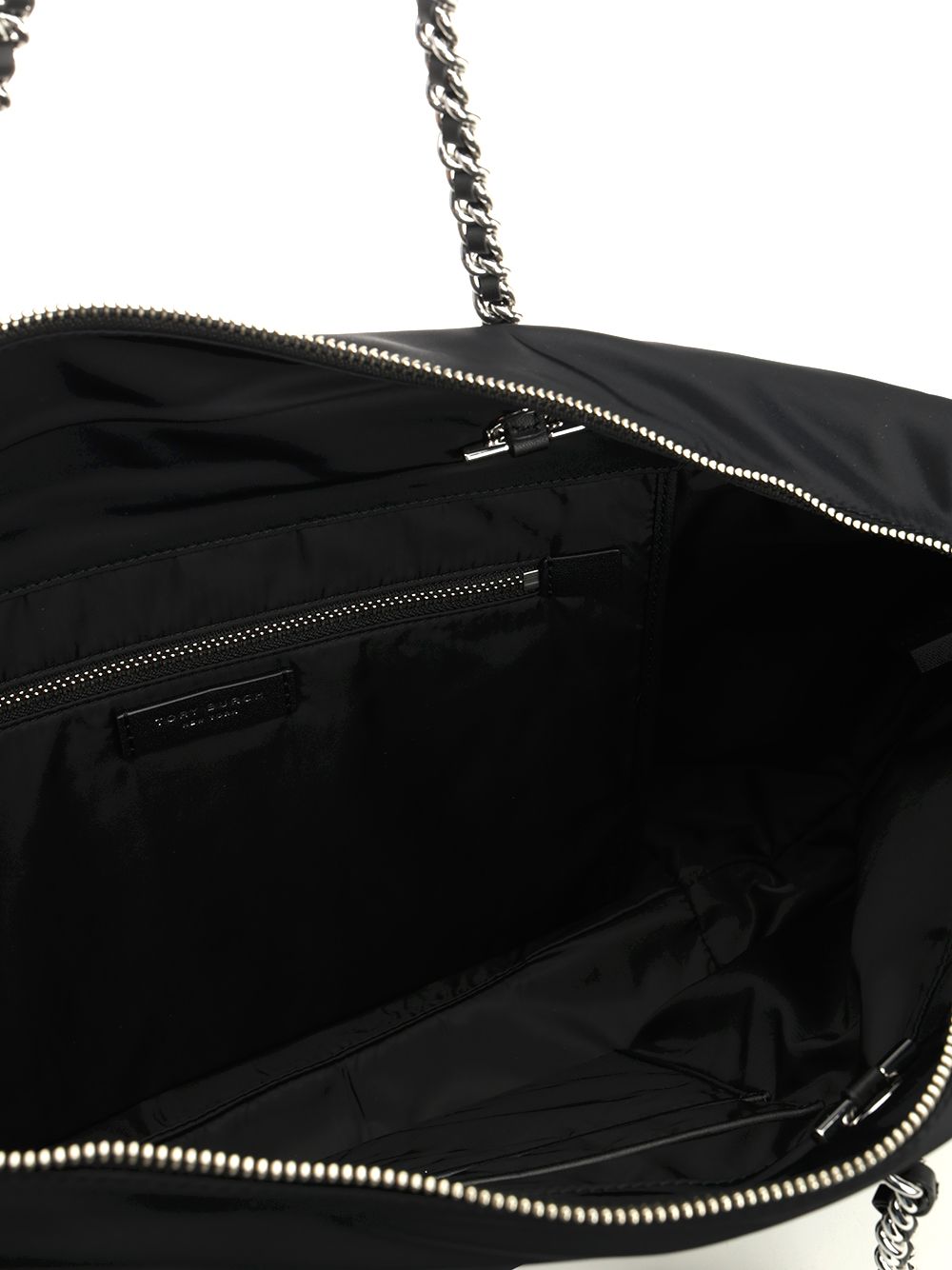Zip closure. Woven cotton and faux leather handles. One external hidden pocket on the logo patch, two internal front welt pockets, and one internal back zip pocket.