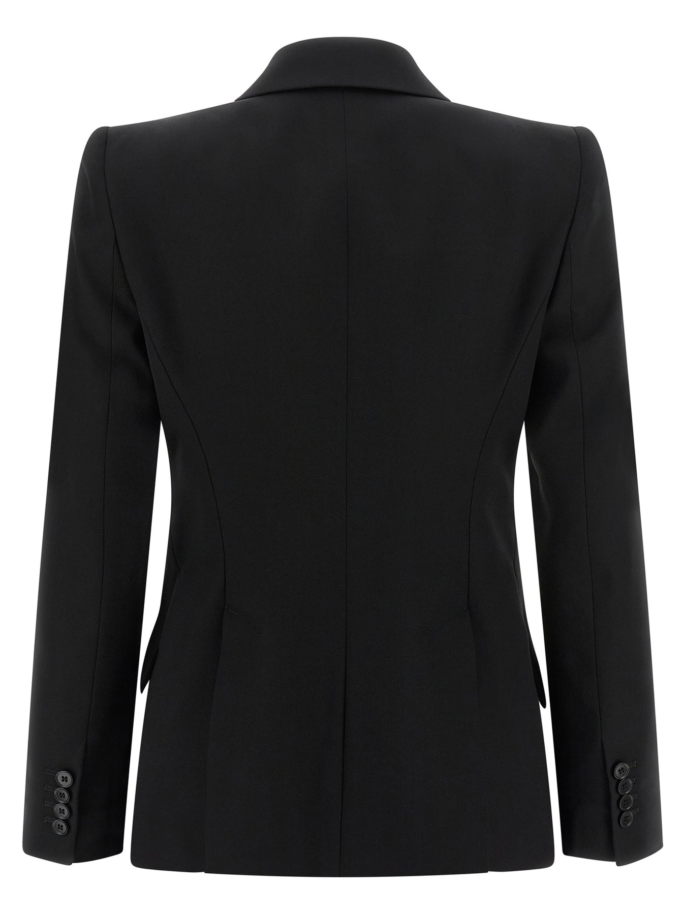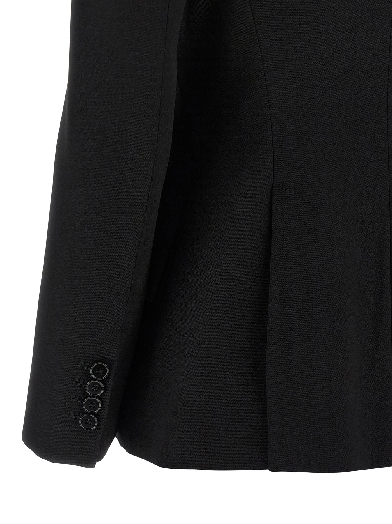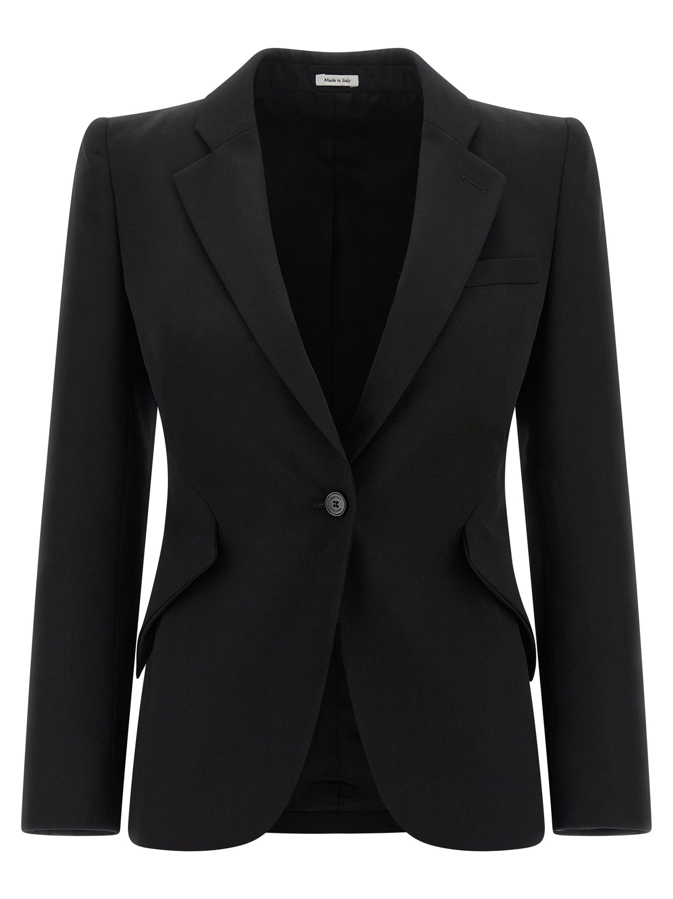 Single-breasted blazer in grain de poudre with hourglass silhouette with front button closure, mirror lapels, breast pocket, slanted flap pockets, slightly pointed padded shoulders, long sleeves, side slits, cupro lining.
