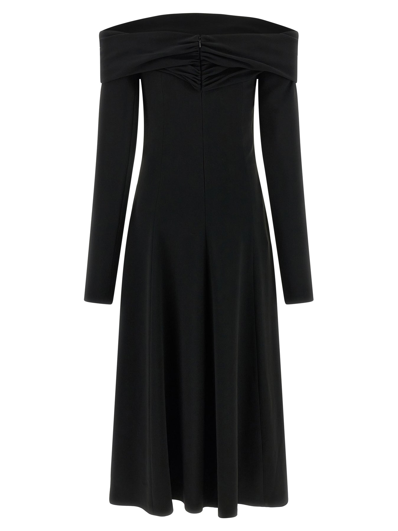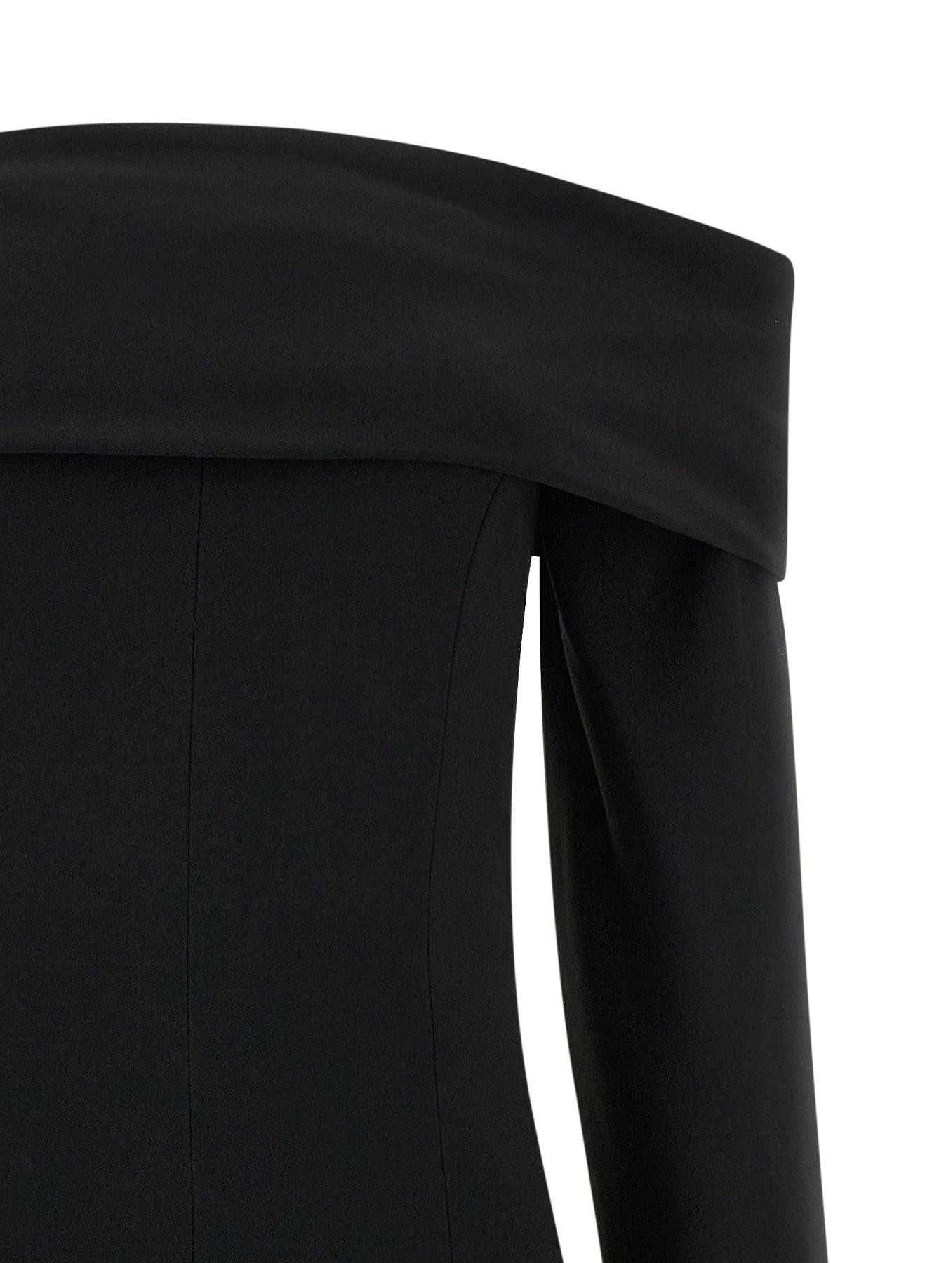 Slightly stretch cady midi dress with off-the-shoulder neckline, tight waist and slightly flared, detachable sleeves, concealed back closure.