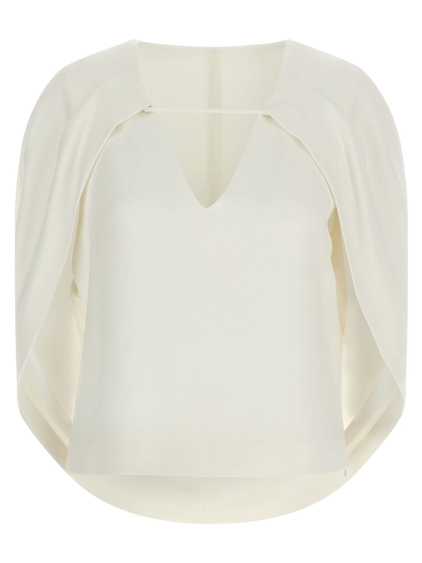 Stretch cady top, cape insert on the shoulders with back draping, V-neck with removable drawstring, side zip closure, symmetrical hem.