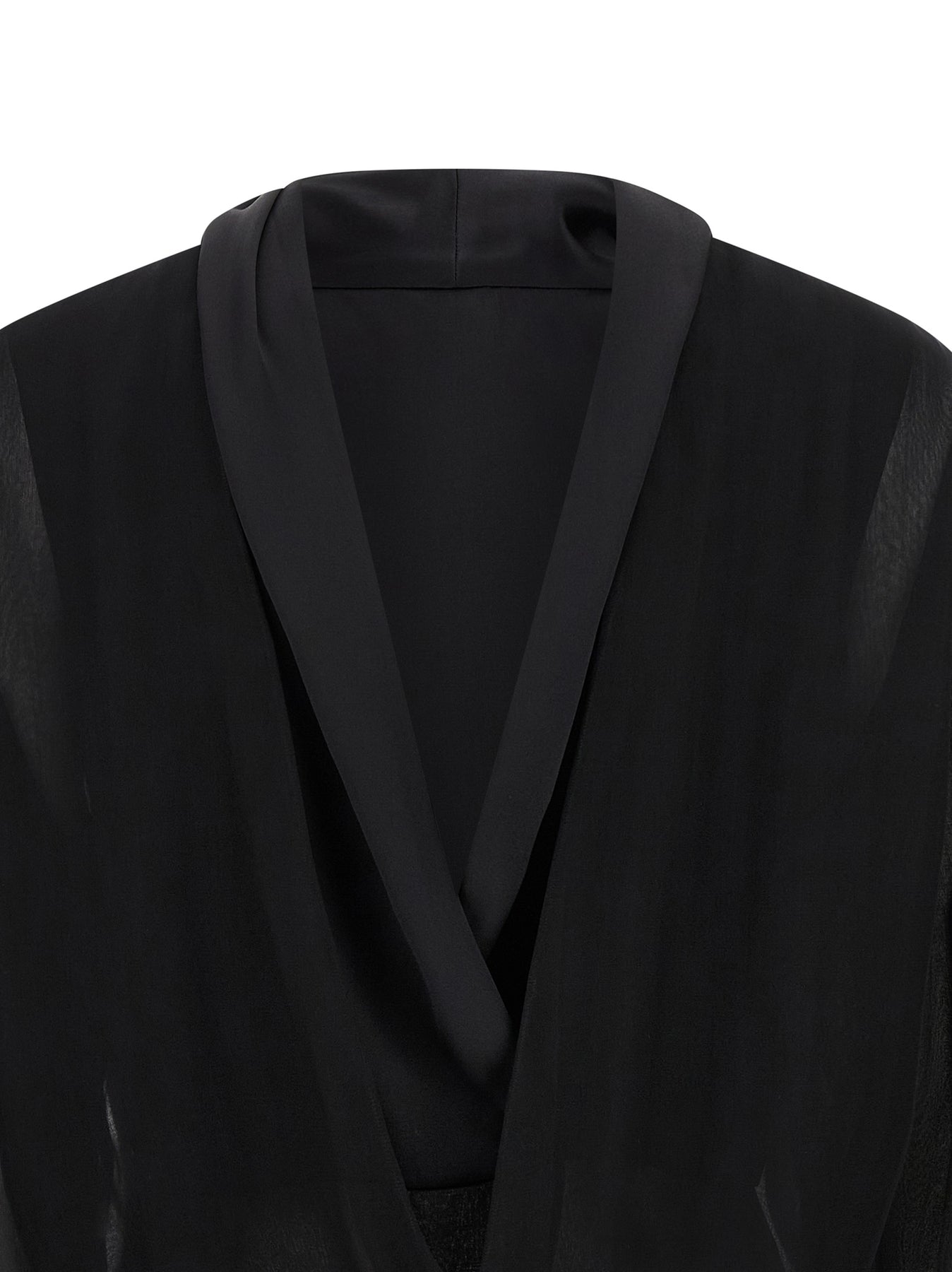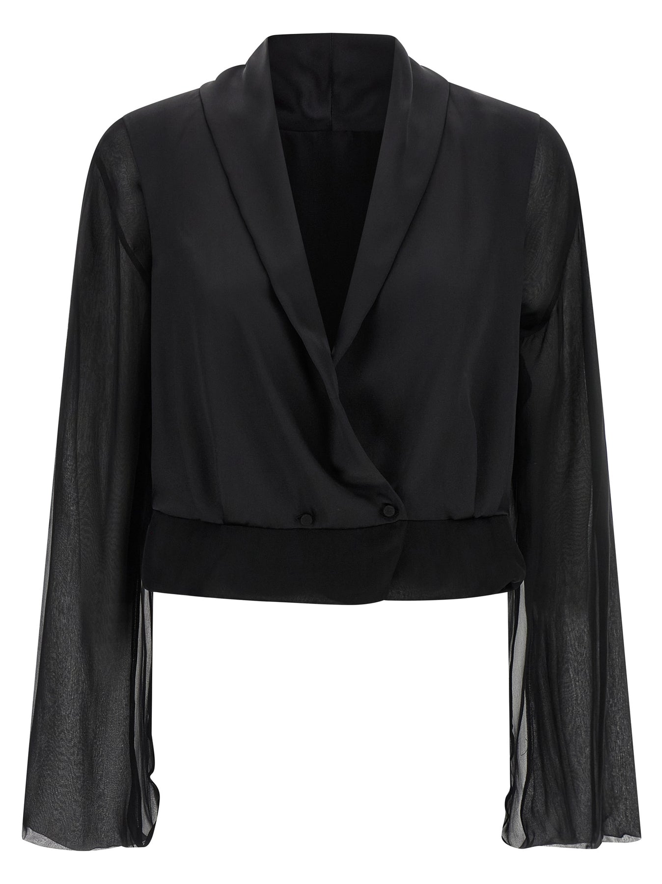 Reversible silk shiffon shirt with back and front neckline, crossed two-button closure, semi-transparent curled long sleeves.