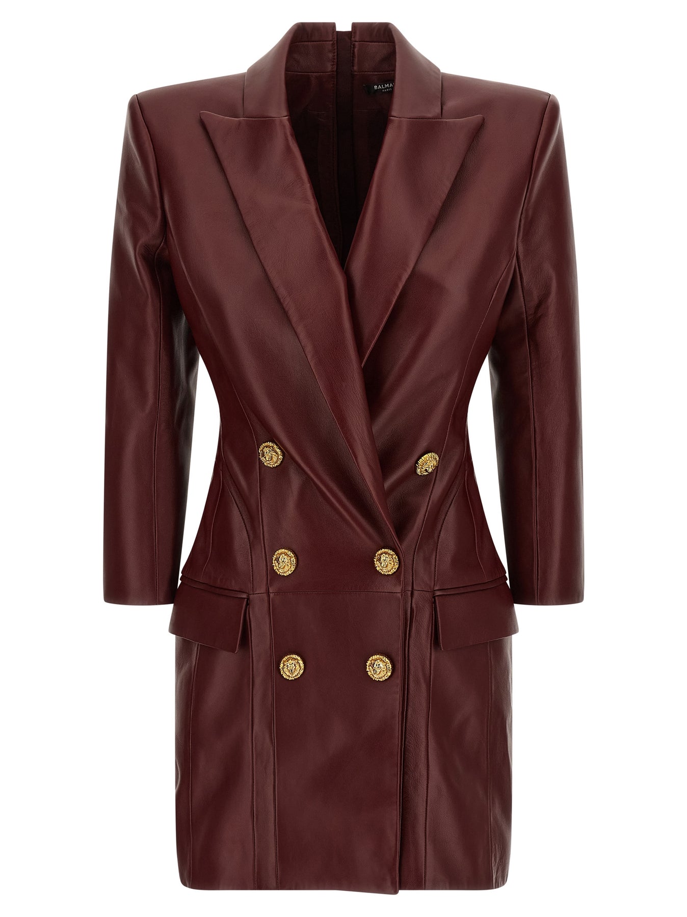 Leather mini dress with double-breasted blazer style, peak lapels, flap pockets, padded shoulder strap, long sleeves, and back zipper closure.