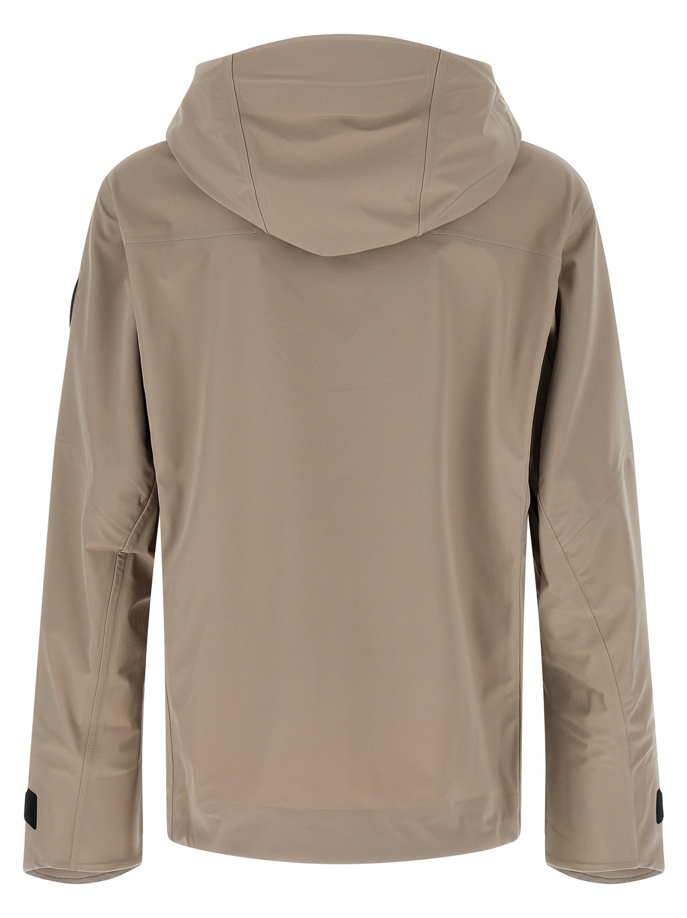 'Rupert' waterproof three-layer flexible fabric rain jacket with fully heat-sealed seams, adjustable hood, ventilation under the arms, front zip and snap button closure, pockets, long sleeves with silicone logo patch, drawstring at the hem, unlined.