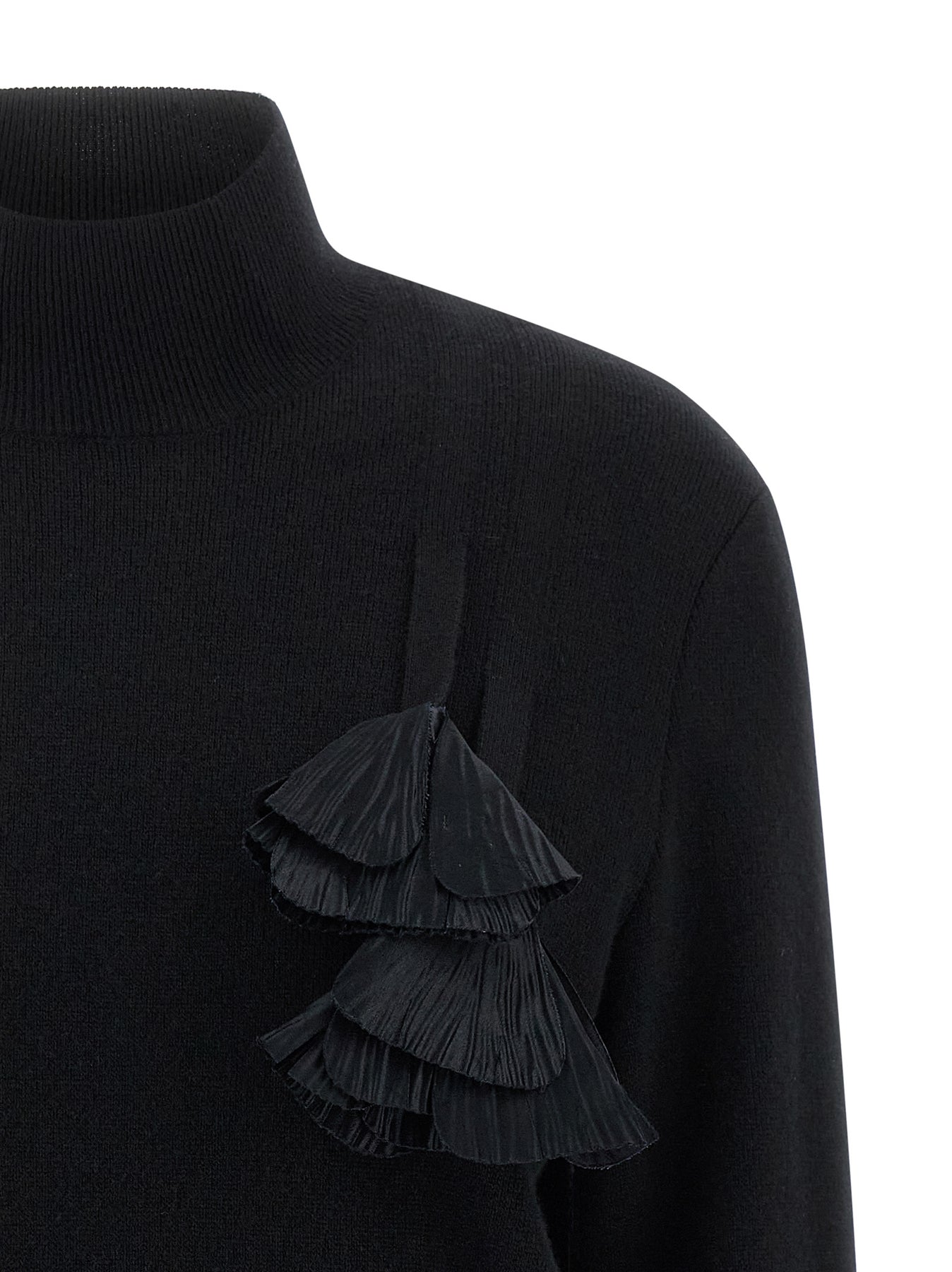 Wool and cashmere sweater with embroidery with front floral insert in ruffled satin, mock collar, long cuffed sleeves.