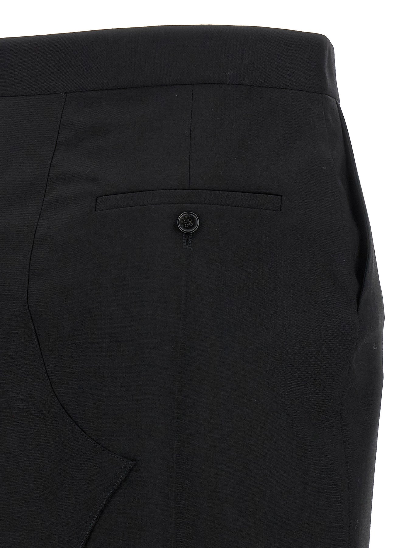 Cool wool midi skirt, exposed striped cupro lining, tailored style with straight line with pleat and stretched pleat, central raw cut split on the front and back, hook and front button zip closure, pockets, asymmetric hem.