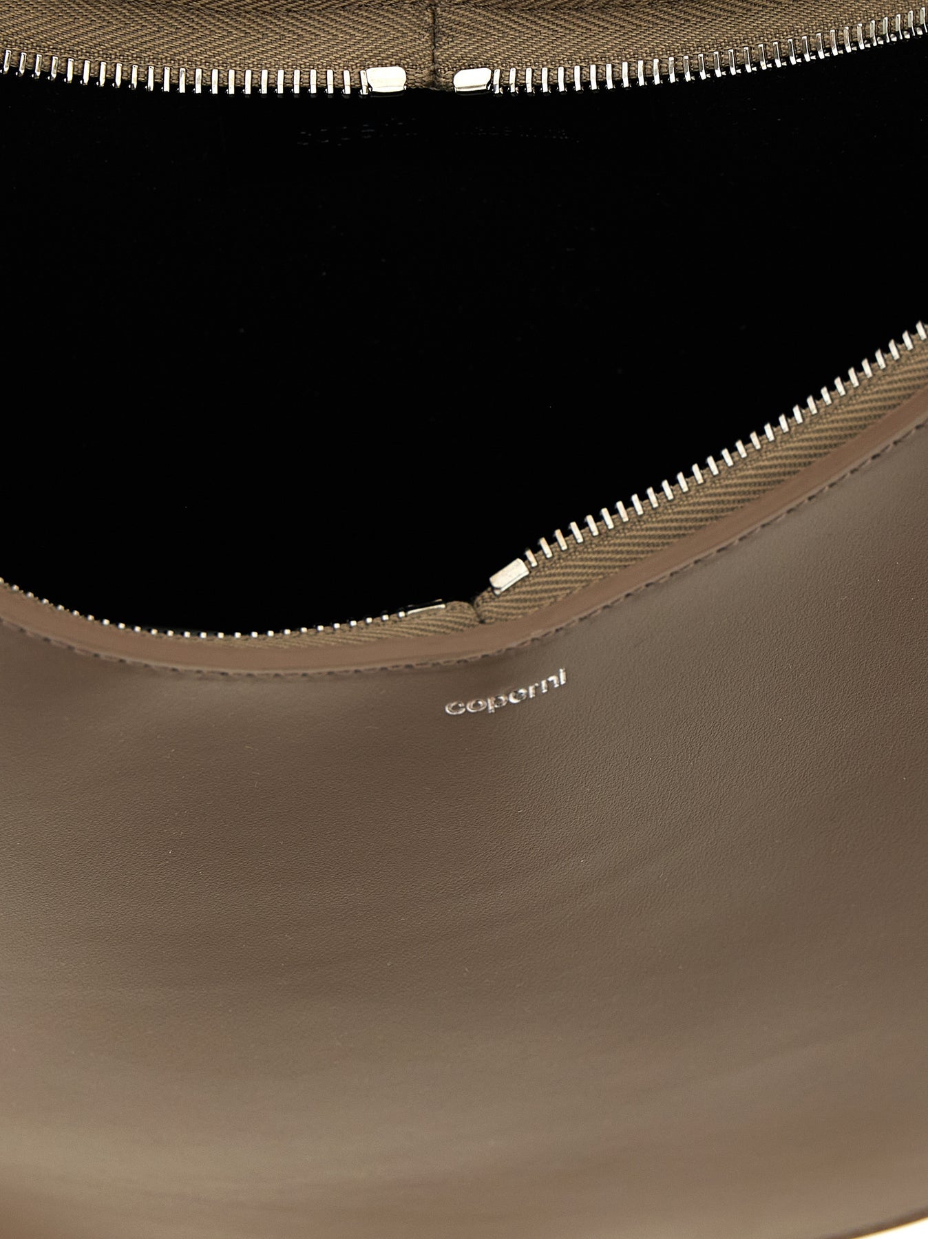 Medium 'Soft Swipe' shoulder bag in smooth leather, shape inspired by the iPhone's 'swipe to unlock' icon, front embossed logo, top zip closure, gusset.
