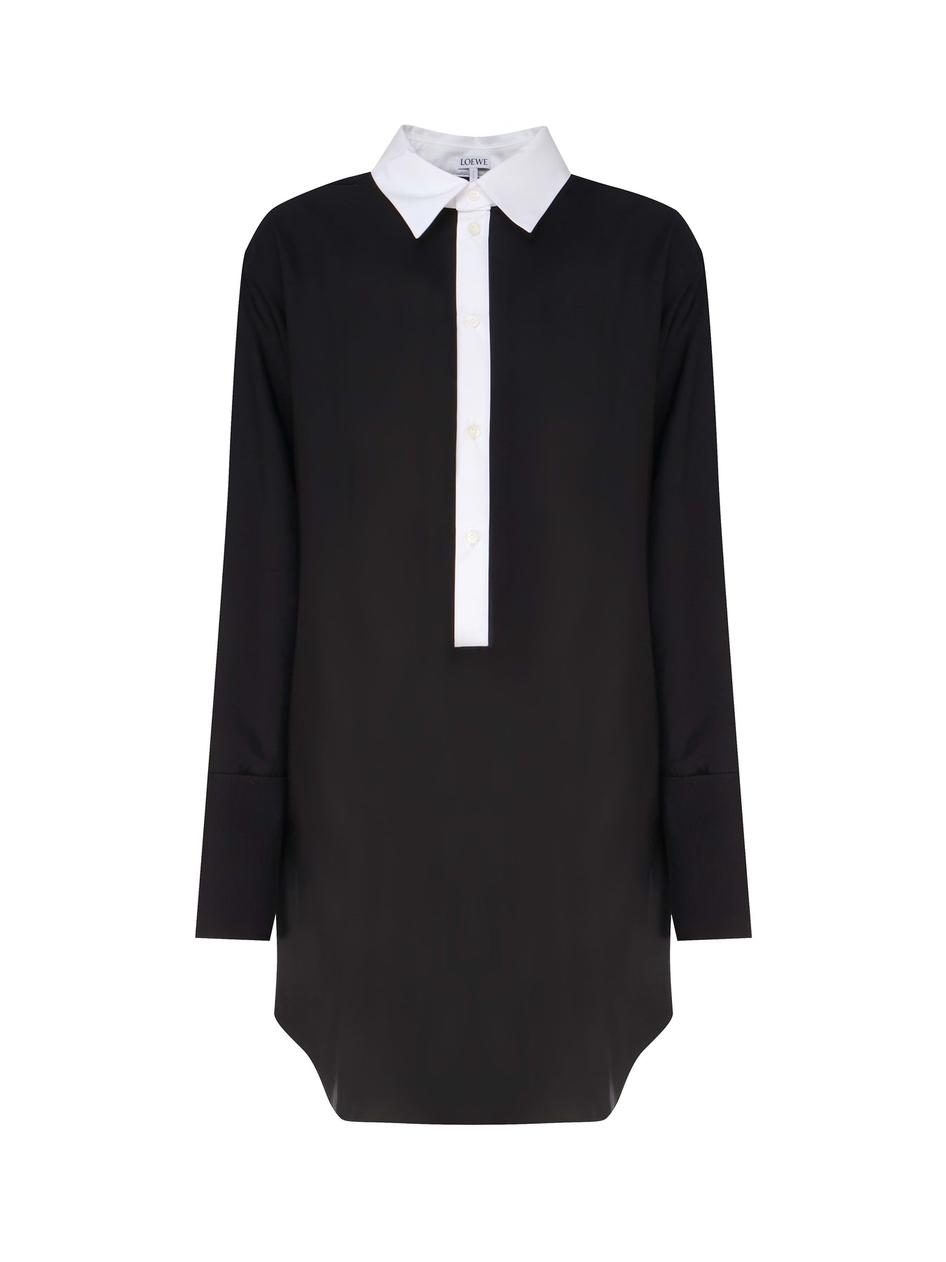 Shirt dress from Loewe in black viscose blend, relaxed fit, knee length, contrasting collar and buttoning, contrasting detachable collar and cuffs, front button closure, box pleat on the back, asymmetric hem from front to back with vents sides, anagram embroidery positioned on the hem.