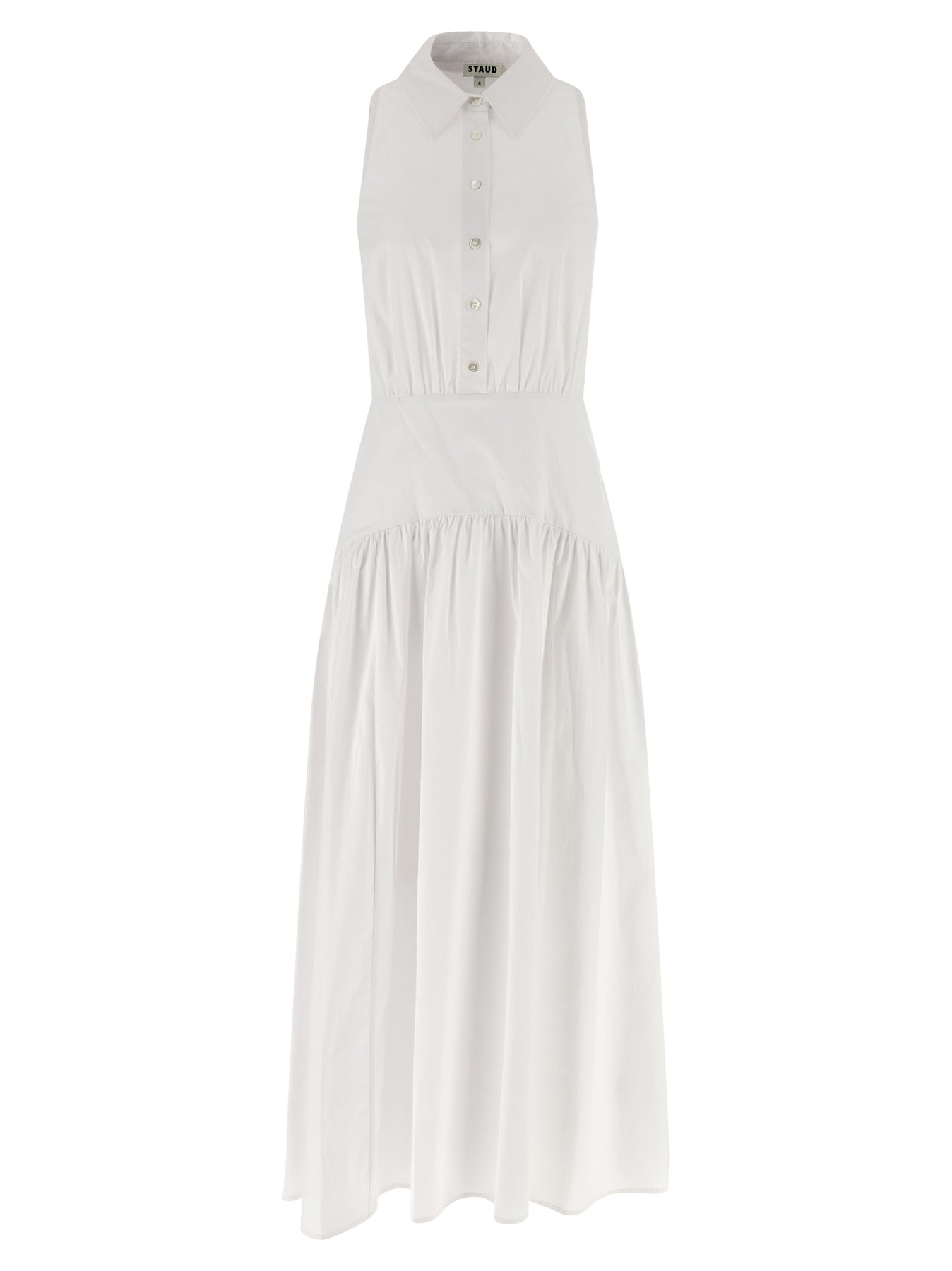 'Romy' dress in cotton poplin, chemisier model, collar, front button closure, wrinkled at the waist with wide skirt, sleeveless.