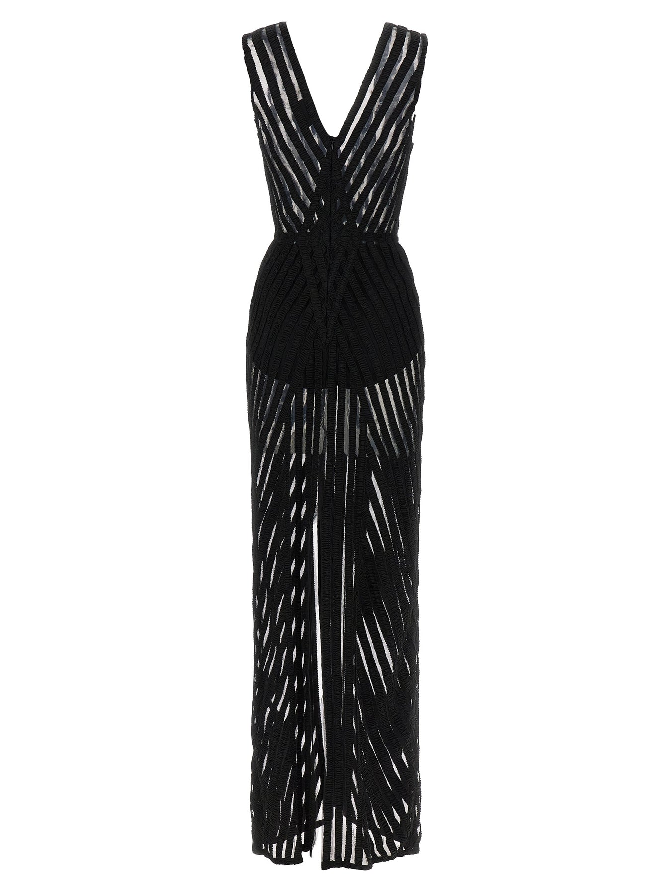 Long 'Red Carpet' dress in tulle and curled bielastic fabric embossed effect striped pattern, I don't see, wide V-neck front and back, sleeveless, zip closure and back split, removable culottes.