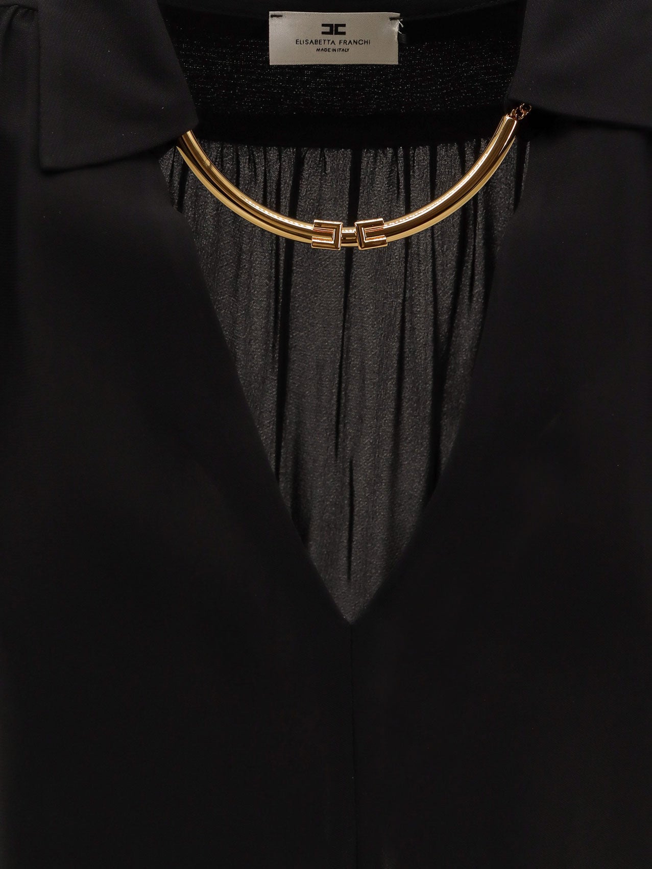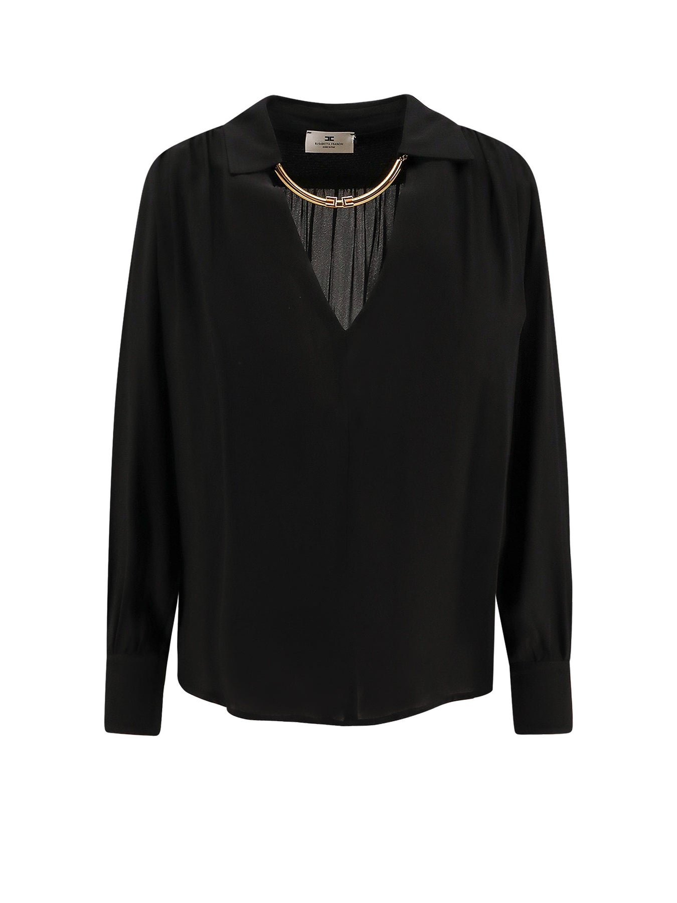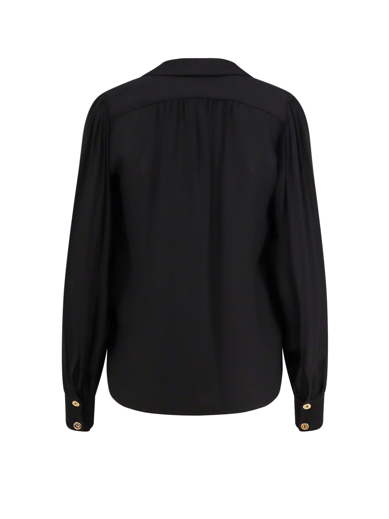 Classic collar with logo metal detail V-neckline Long sleeve with metal cuff and buttons Made in Italy 100% viscose SKU: CA12356E2110