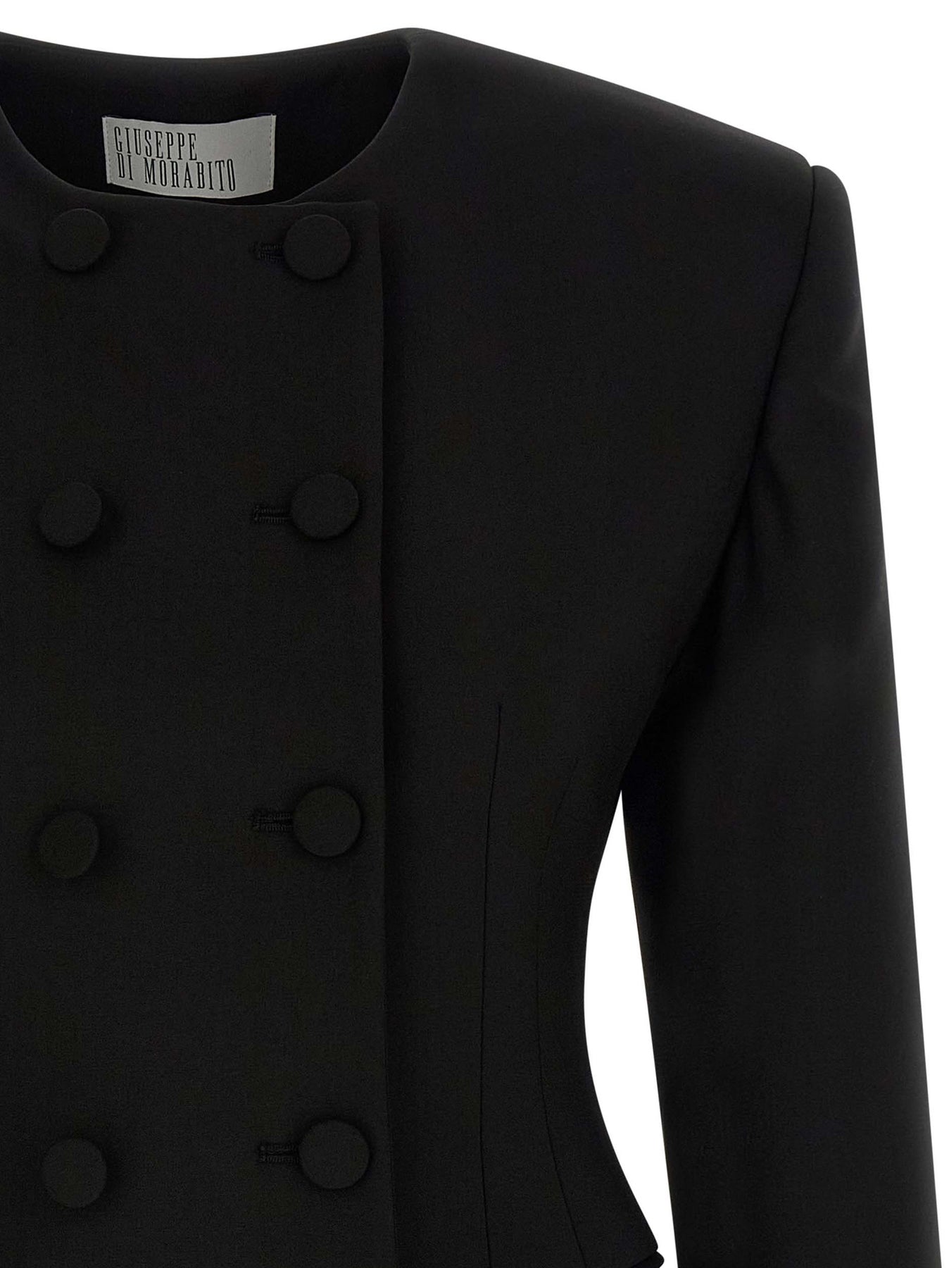 Double-breasted wool canvas blazer dress with front button closure, round neckline, hourglass silhouette, flap pockets, long sleeves, extra padded shoulder strap, lining.
