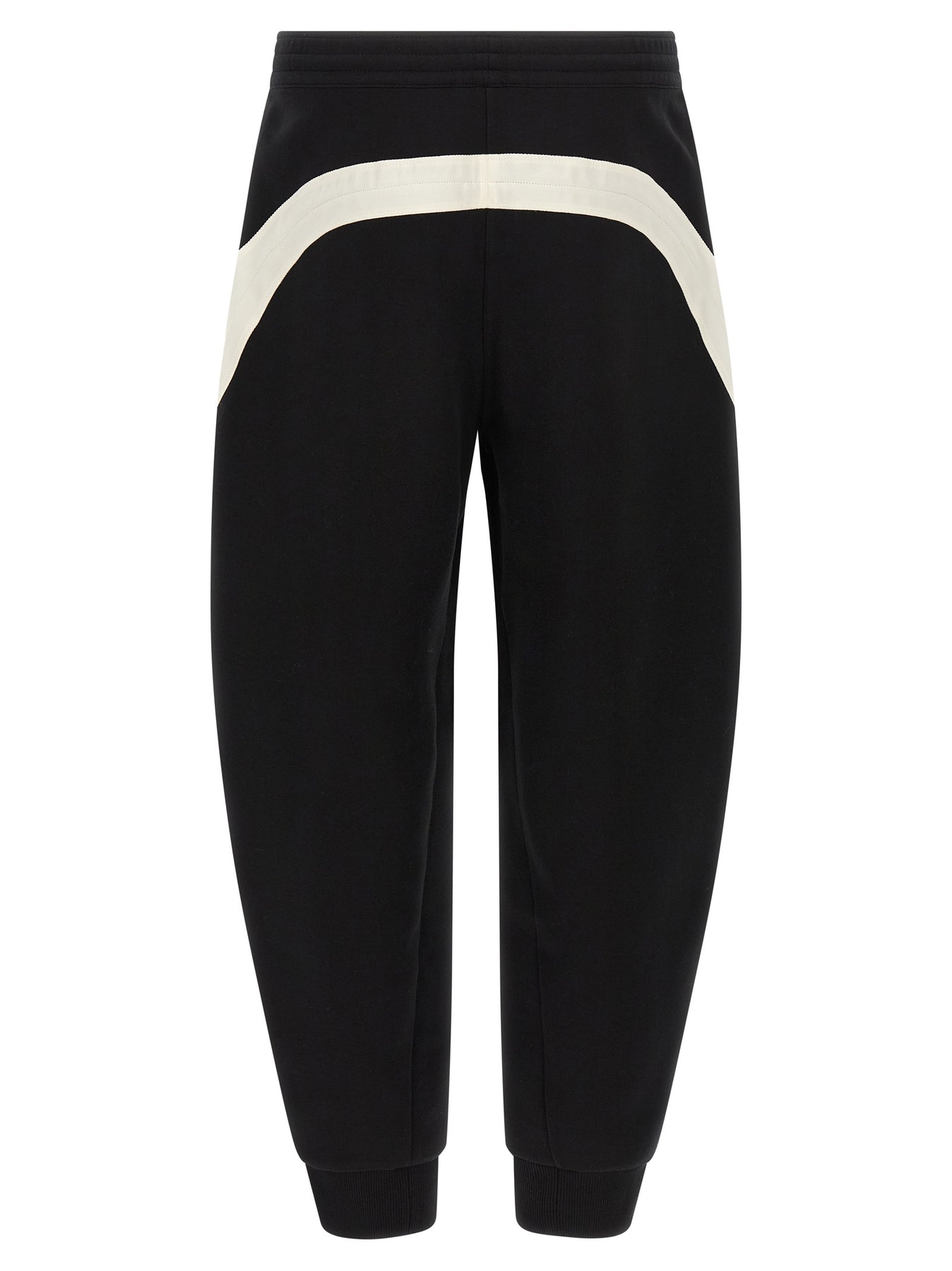 Stretch cotton blend joggers with contrast satin insert, front logo embroidery, adjustable drawstring elastic at the waist, pockets, and ankle cuffs.