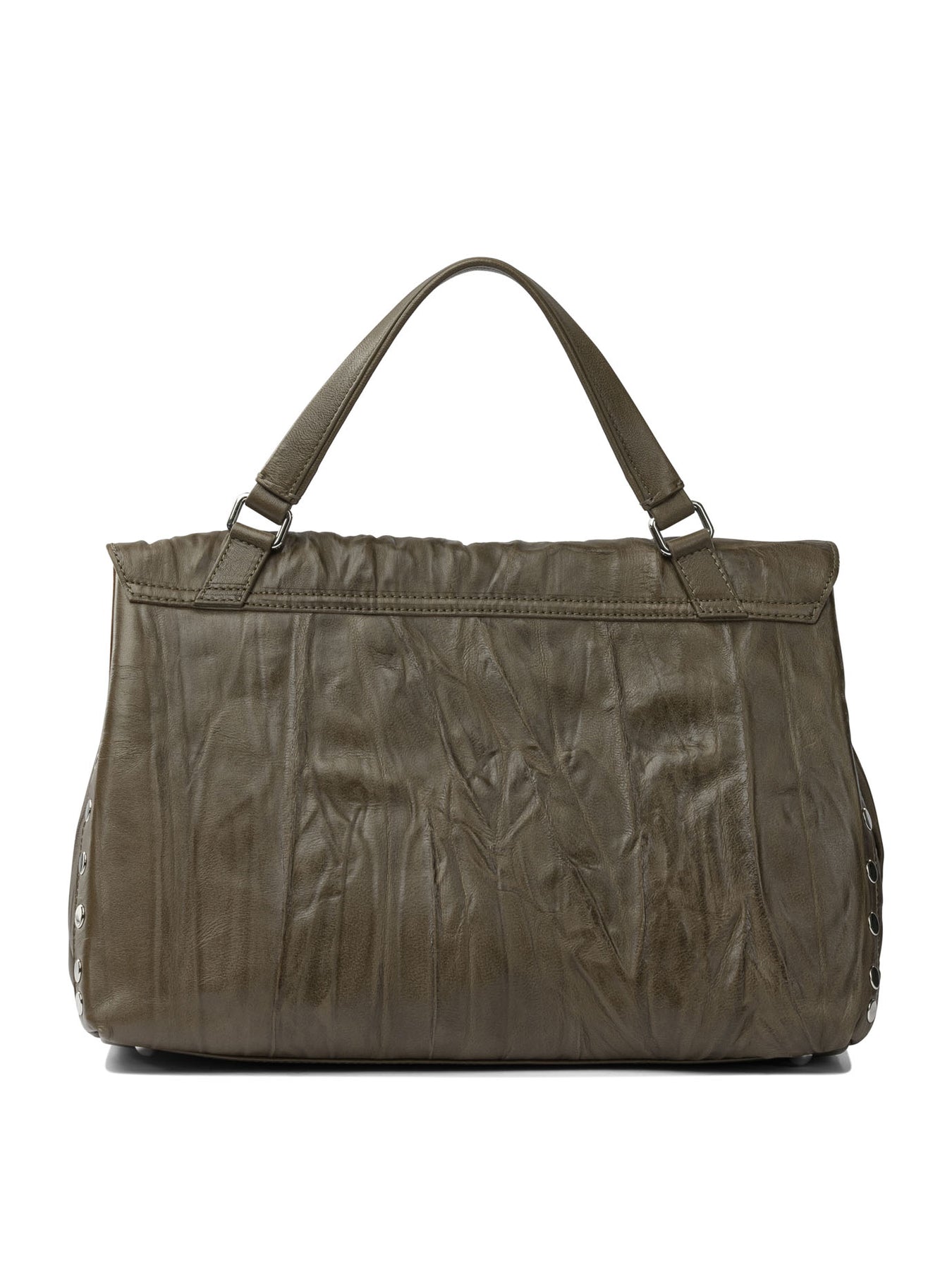 Zanellato "Postina Plissè" handbag made of calfskin leather with a pleated surface with natural opacity. Compact structure with defined silhouette, ribbed yoke and hand-stitched stitching. Top closure with metal flap and spool, short leather handle, studded side elements. Interior divided into two compartments, completed with interior slit pocket and metal zipper pocket. || - Full-grain calfskin leather - Hand pleated workmanship - Adjustable and removable leather shoulder strap - Ribbed yoke - Metal spool flap closure - Stud detail on the sides - Inside slit pocket - Inside pocket with metal zipper