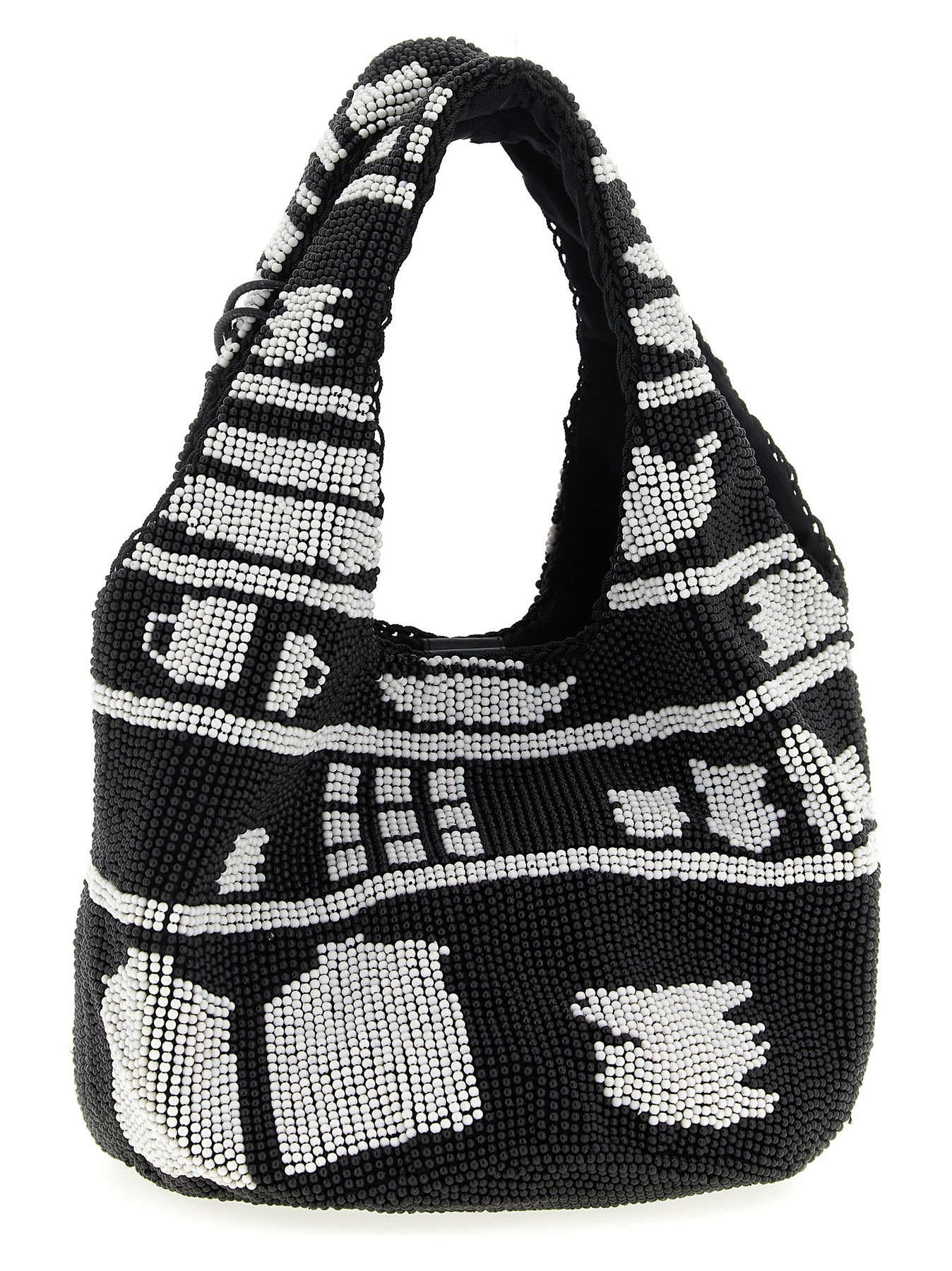 'Beaded' mini fabric shopping bag covered with ceramic beads, cotton canvas lining, double fixed handle, magnetic closure, leather and removable plastic logo pendant.
