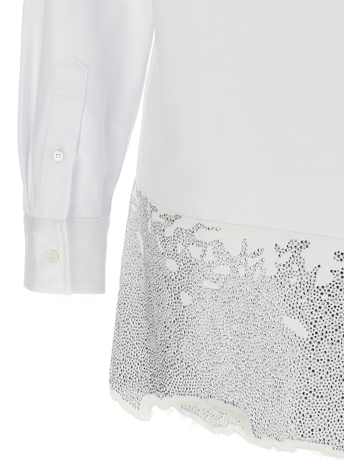 Cotton shirt dress with frayed rhinestone hem, button closure, long cuffed sleeves.